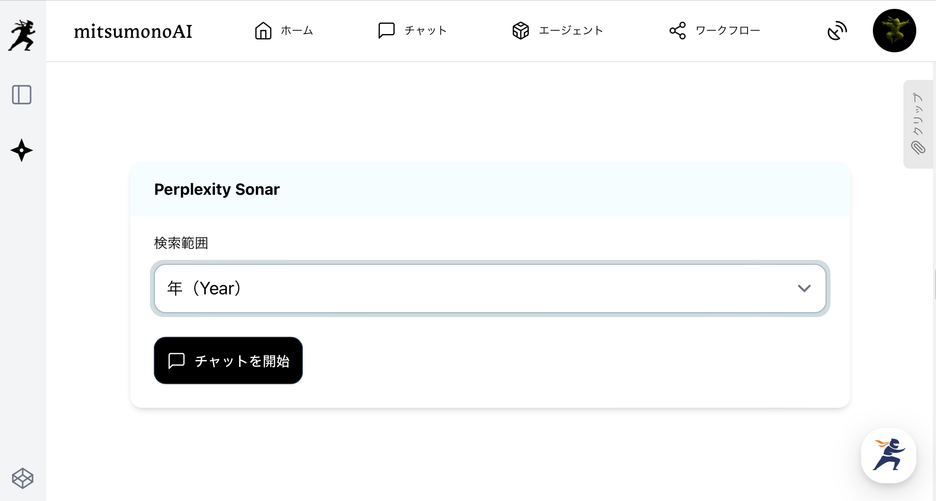 まず、AIモデルから「Perplexity Sonar」を選び、検索範囲は「年」を選択して「チャットを開始」します。