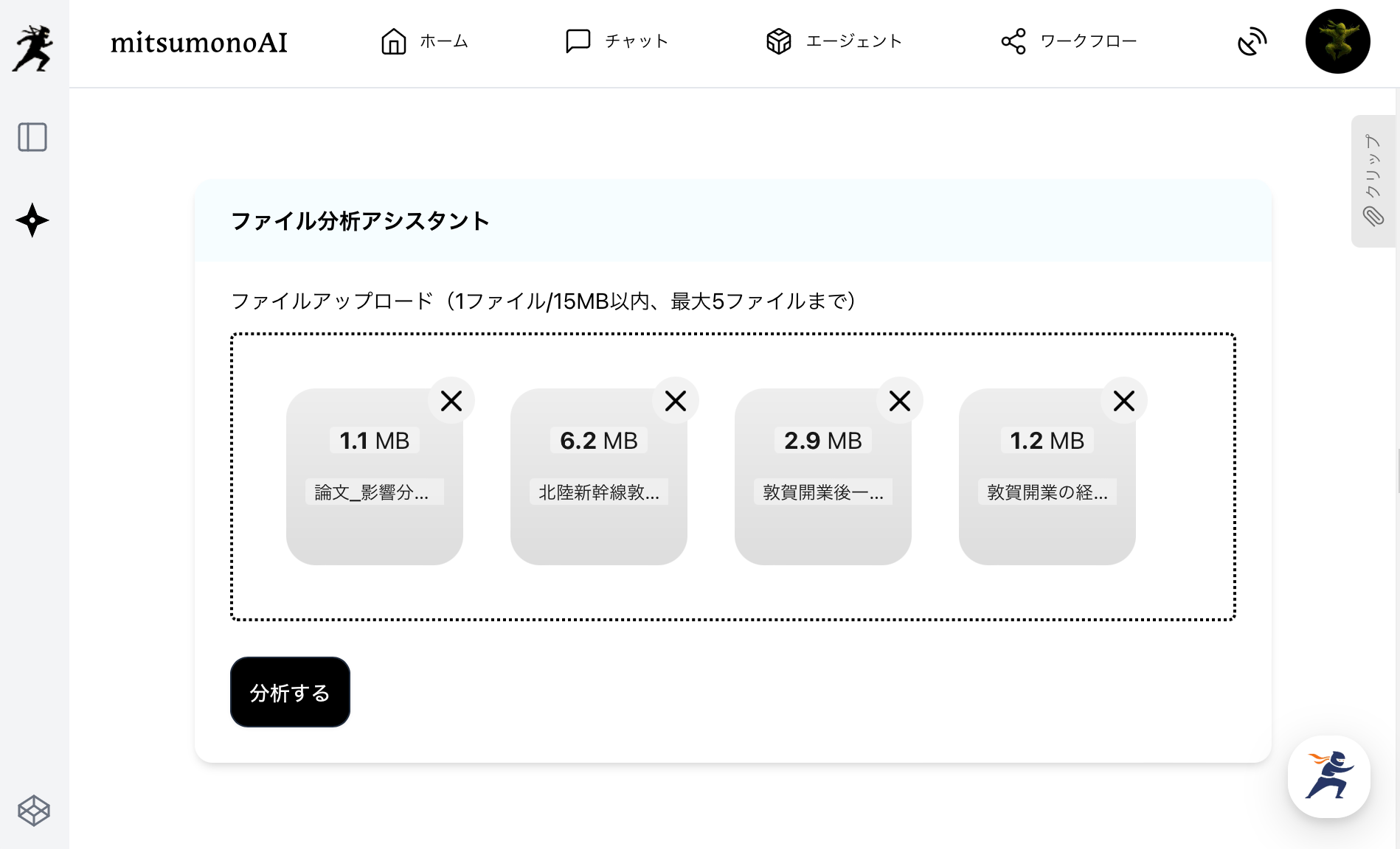 まず、収集した資料を「ファイル分析アシスタント」にアップロードし、「分析する」をクリックします。
