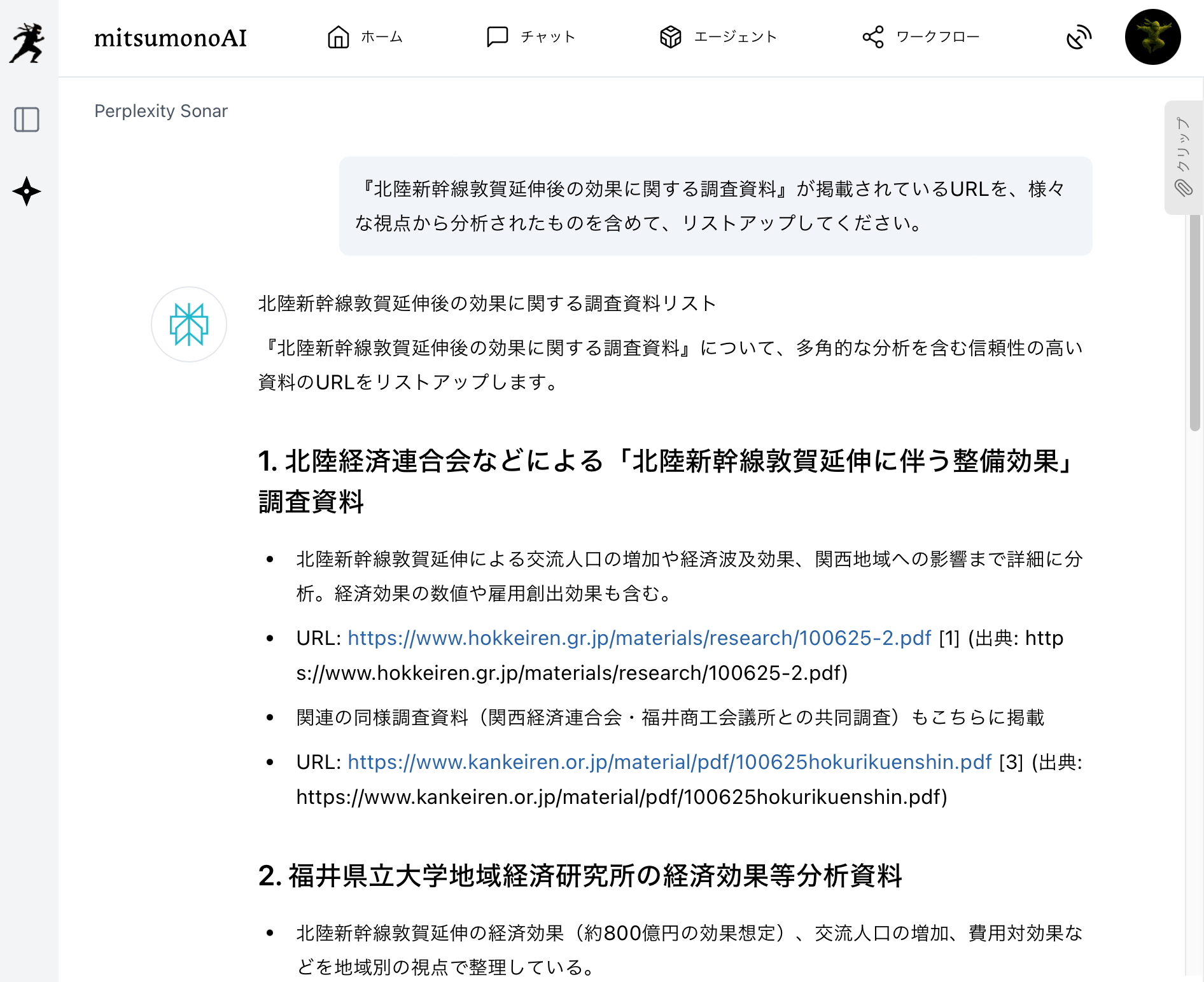 以下のように指示を出して、『北陸新幹線敦賀延伸後の効果』に関する、様々な視点から分析された調査資料を網羅的に収集します。