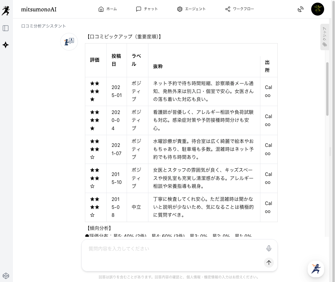 ポジティブ・ネガティブな意見の傾向を分析させることで、患者が何を評価し、何に不満を感じているのかを定量的に把握できます。