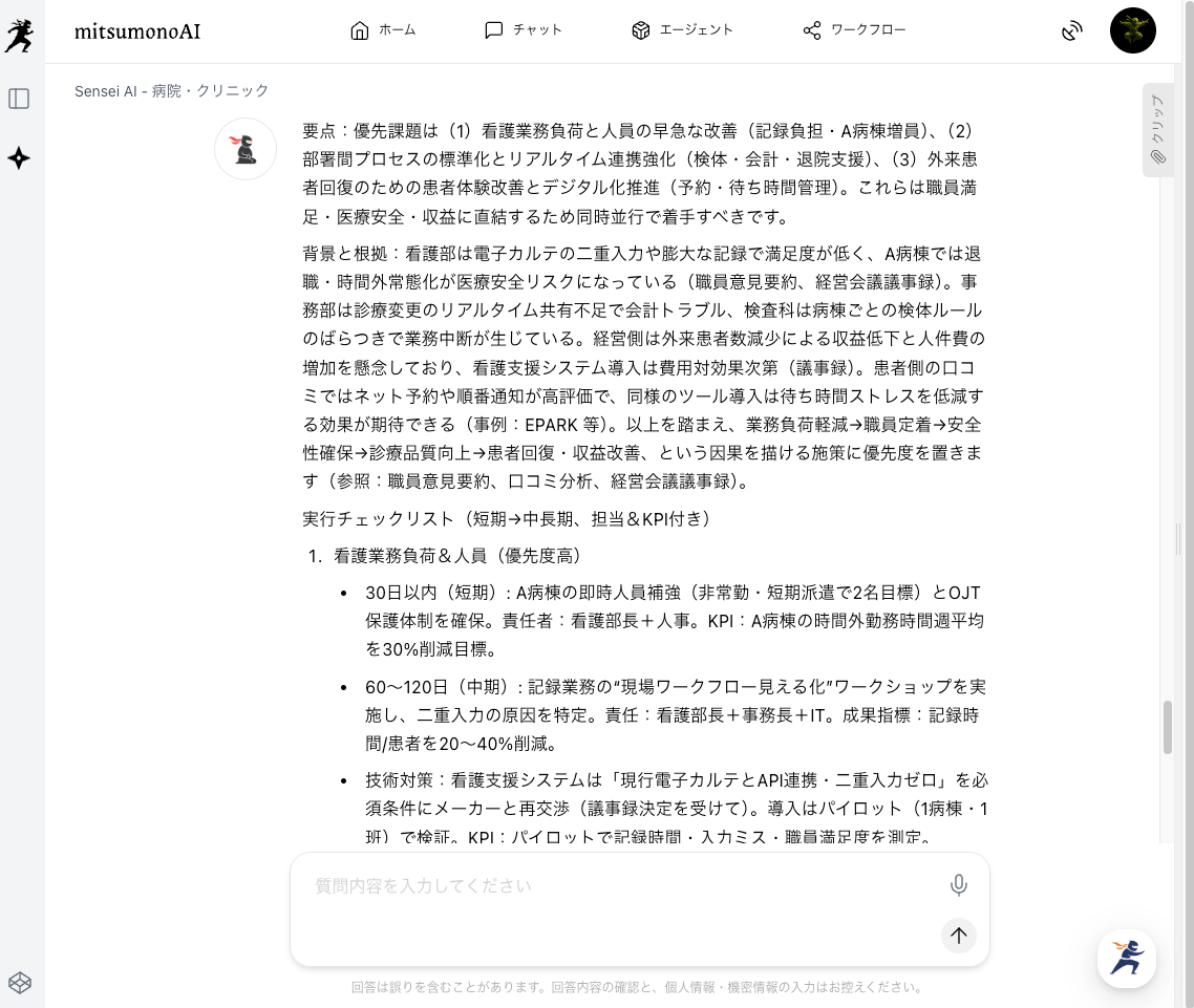 「Sensei AI - 病院・クリニック」を使い、ステップ1, 2の分析結果と、経営会議の議事録や事業計画書などのテキストを一緒に貼り付けます。