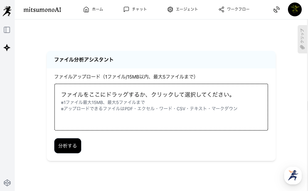 「ファイル分析アシスタント」に、ステップ1で準備した顧客データファイルをアップロードし、分析を開始します。
