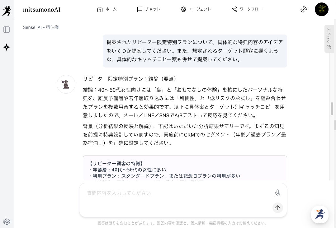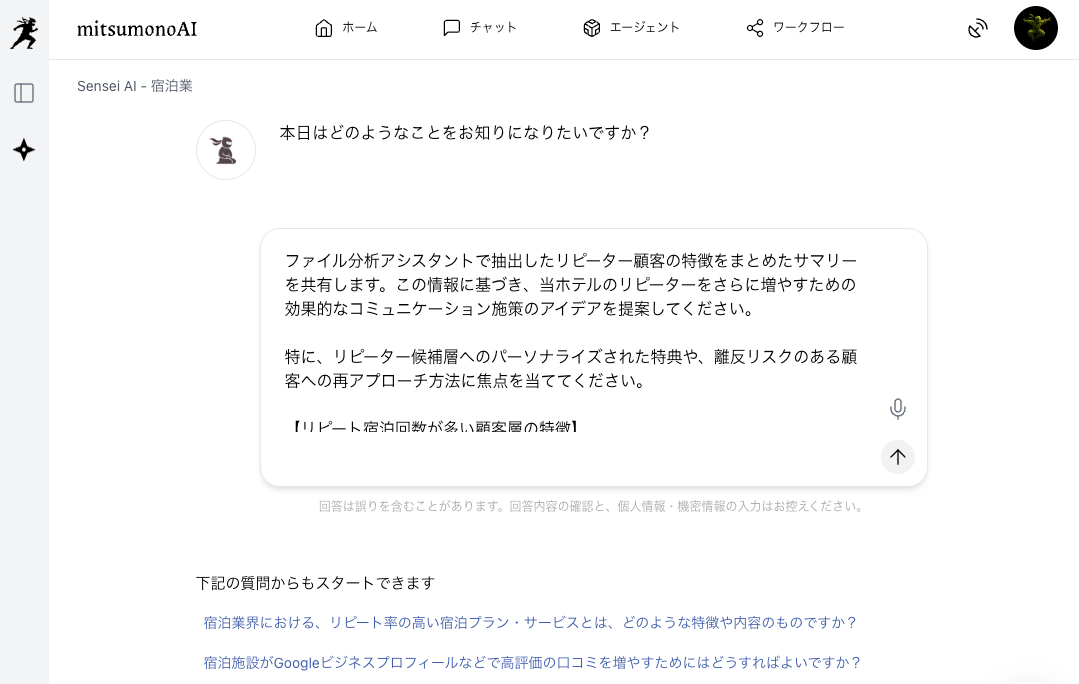 「ファイル分析アシスタント」の分析結果サマリーを「Sensei AI - 宿泊業」に共有し、リピーターとなりうる顧客層の特定、および個別のアプローチ方法やコミュニケーション施策の検討を行います。