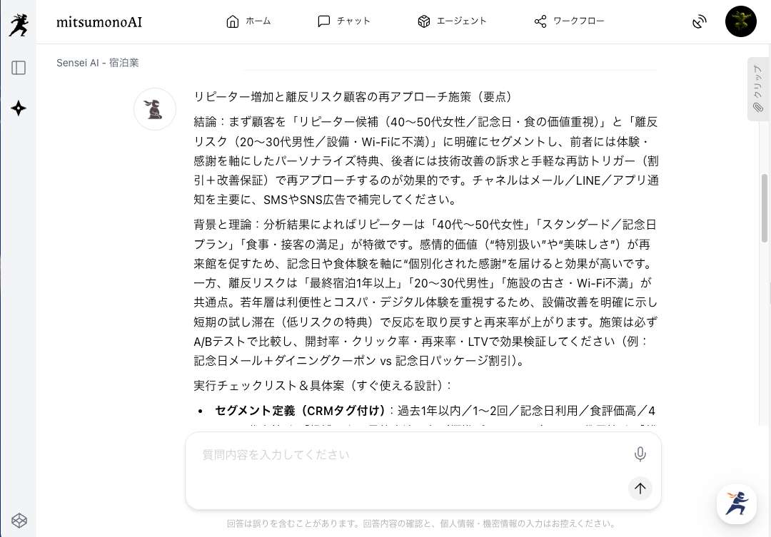 本記事では、mitsumonoAIの「ファイル分析アシスタント」と「Sensei AI - 宿泊業」を組み合わせることで、どのように顧客データを分析し、リピーター獲得の鍵を見つけ出すのか、具体的な活用方法をご紹介します。蓄積されたデータからリピーターの傾向を掴み、効果的なアプローチを実行することで、確かな成果に繋げていきましょう。