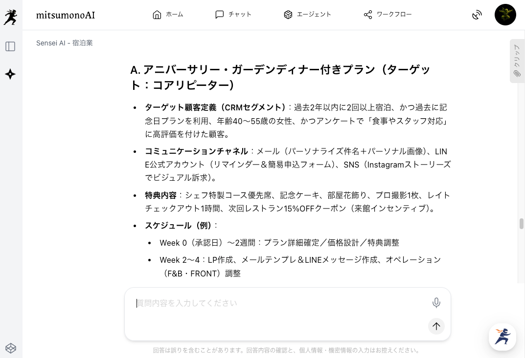 ・”Sensei AI - 宿泊業”による、リピーター育成のためのパーソナライズされたコミュニケーション施策案の作成(メール、SNS広告、限定プラン提案など):10件