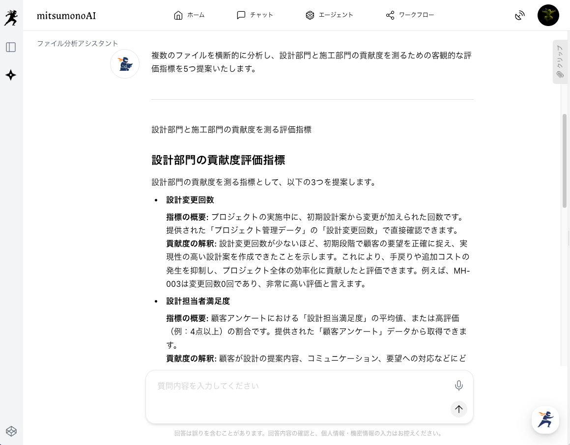 「これらのファイルを横断的に分析し、設計部門と施工部門の貢献度を測ることができる、客観的な評価指標を5つ提案してください。」