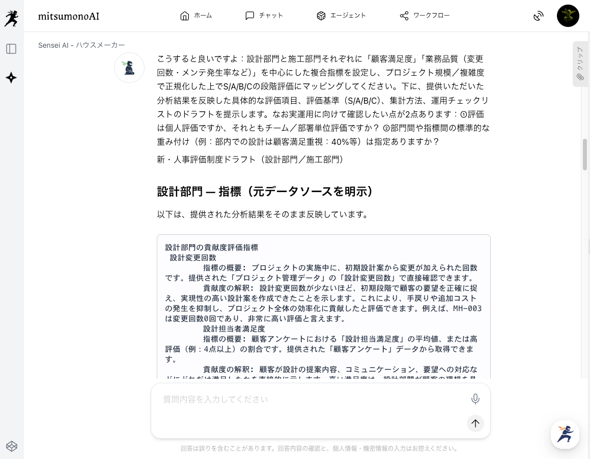 ハウスメーカーの職種ごとの役割や特性を理解したAIと共に、全部門が納得できるような評価制度のたたき台を作成しましょう。