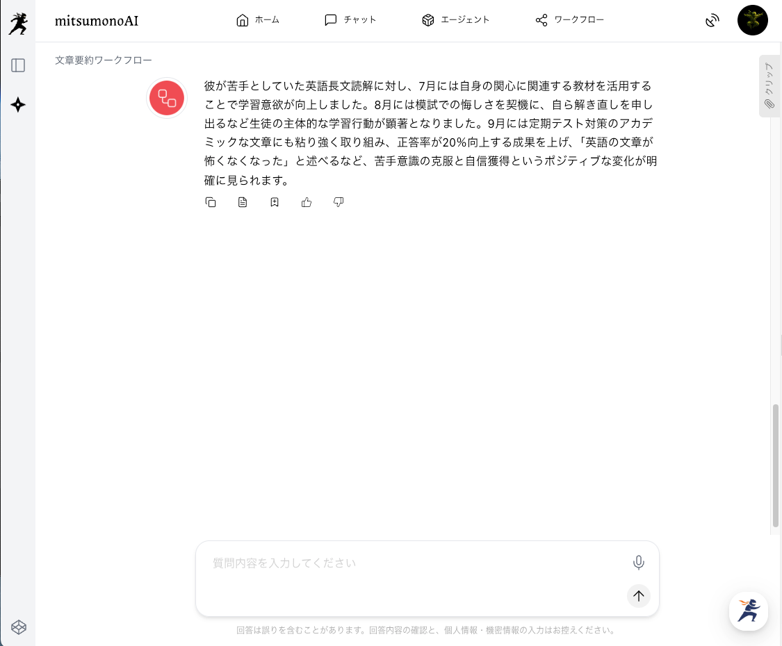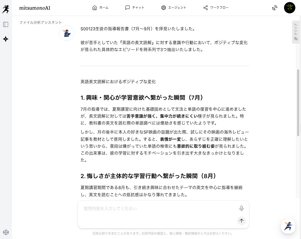 AIは、「最初は単語を調べるのも億劫そうだったが、好きな映画の話題から英文に興味を持ち始めた(7月)」といった、ストーリーの核となる事実を客観的に抽出します。