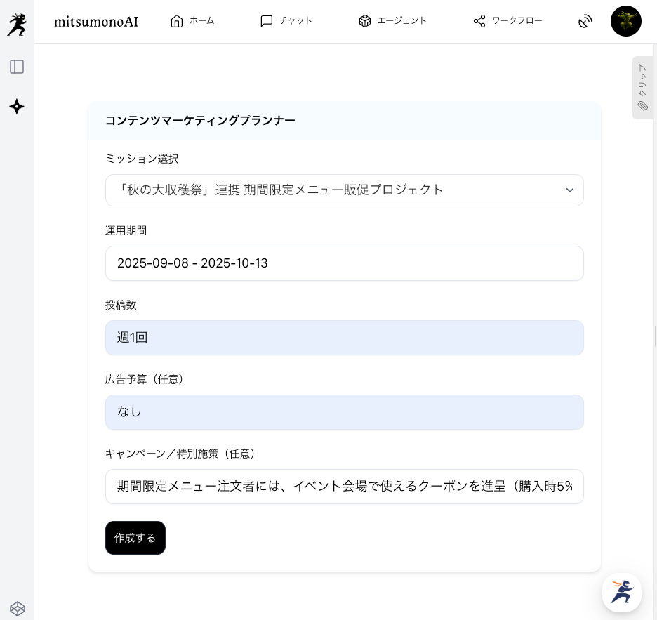 ステップ1でSensei AIから得たアドバイスと、自社の強みを基に、「商品・メニュー開発プランナー」を活用し、地域イベントと連動した期間限定メニューの具体的な内容を入力します。