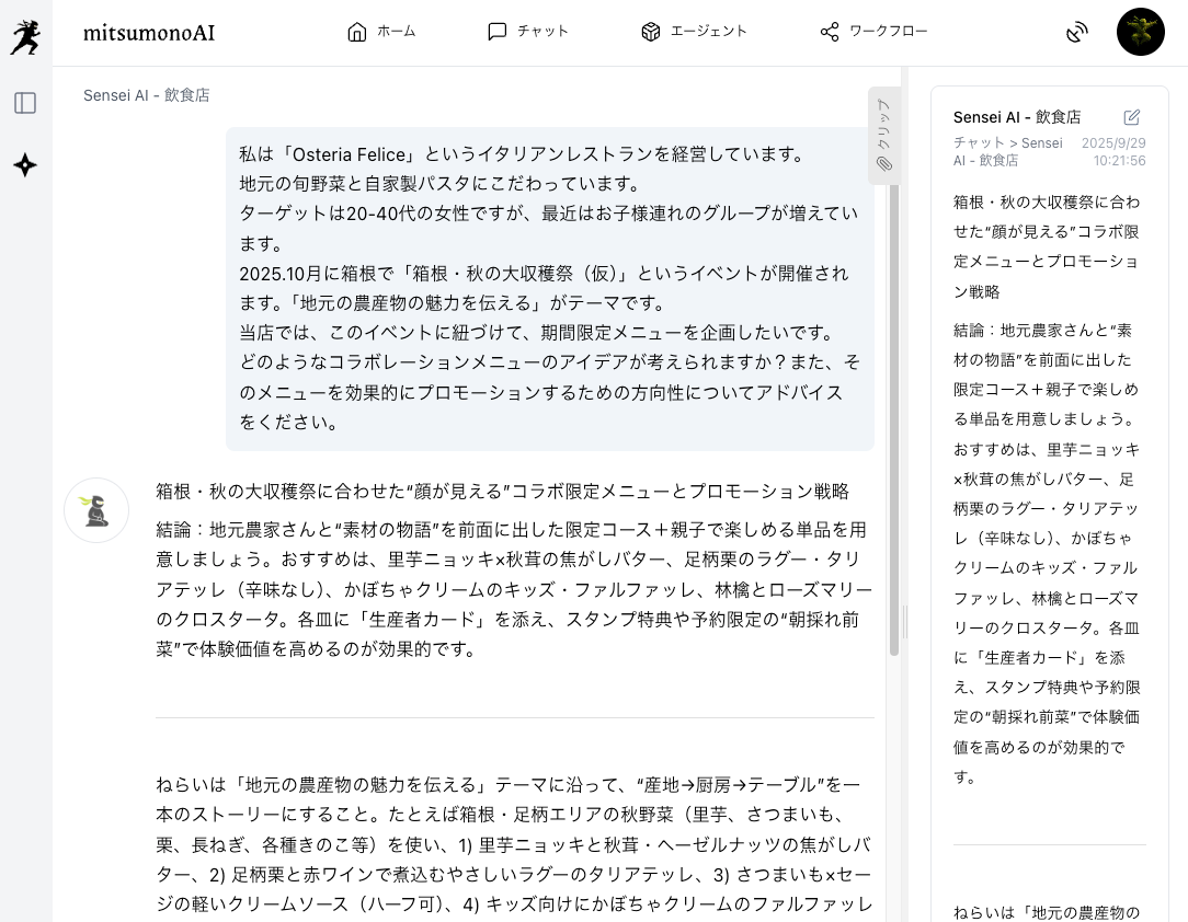 まず、「Sensei AI - 飲食店」に、連携したい地域イベント情報、飲食店のコンセプト、ターゲット層といった情報を相談し、コラボレーションメニューのアイデアやプロモーションの方向性についてアドバイスを得ます。
