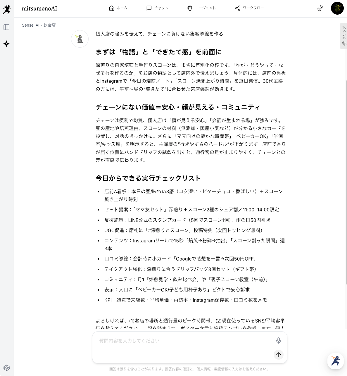 「集客アイデアを出して」という単純な指示でも、ミッション(店の強み)を踏まえた、あなたのお店だけのオリジナル案が返ってきます。 - ブランドがブレない: