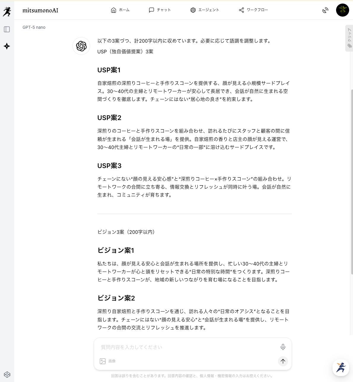 - 「うちの店はこんな感じ」と伝えるだけで、それっぽい「USP」や「ビジョン」の候補を複数案作成します。