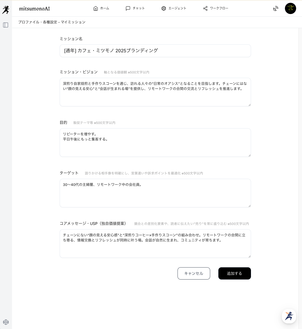 では、AI初心者のカフェのオーナーが、「とりあえずのミッション」を作成し、登録するまでの流れをシミュレーションしてみましょう。