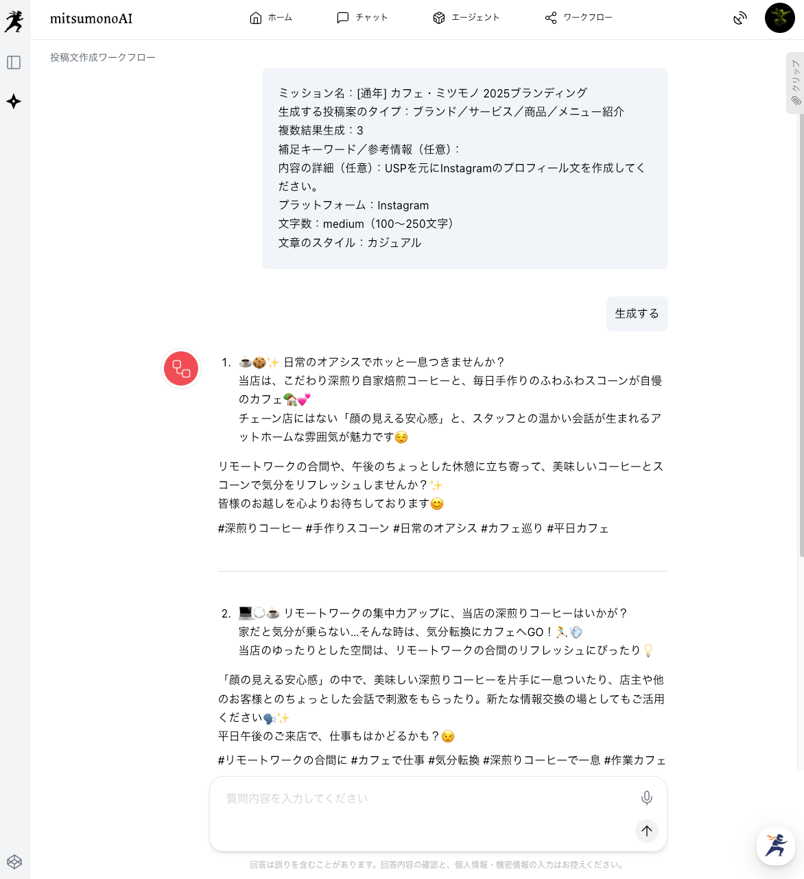 登録したUSPを元に、「投稿文作成ワークフロー」でInstagramのプロフィール文を作成すれば、魅力的な紹介文が瞬時に完成します。