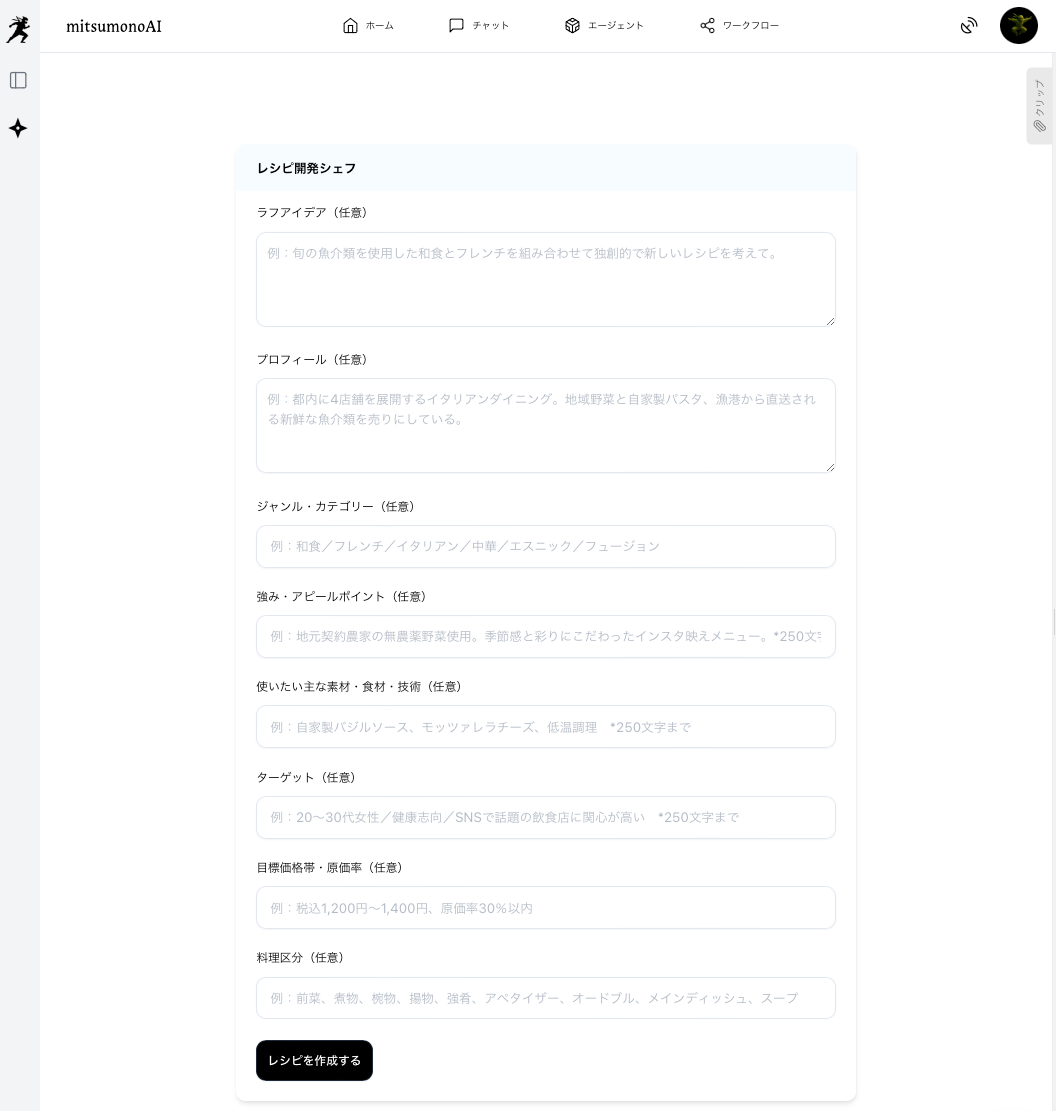 レシピ開発シェフは、特定の食材やコンセプト、ターゲット顧客に基づき、独創的な新メニューやプランのアイデアを、完成イメージ画像も含めて具体的に考案・提案するツールです。