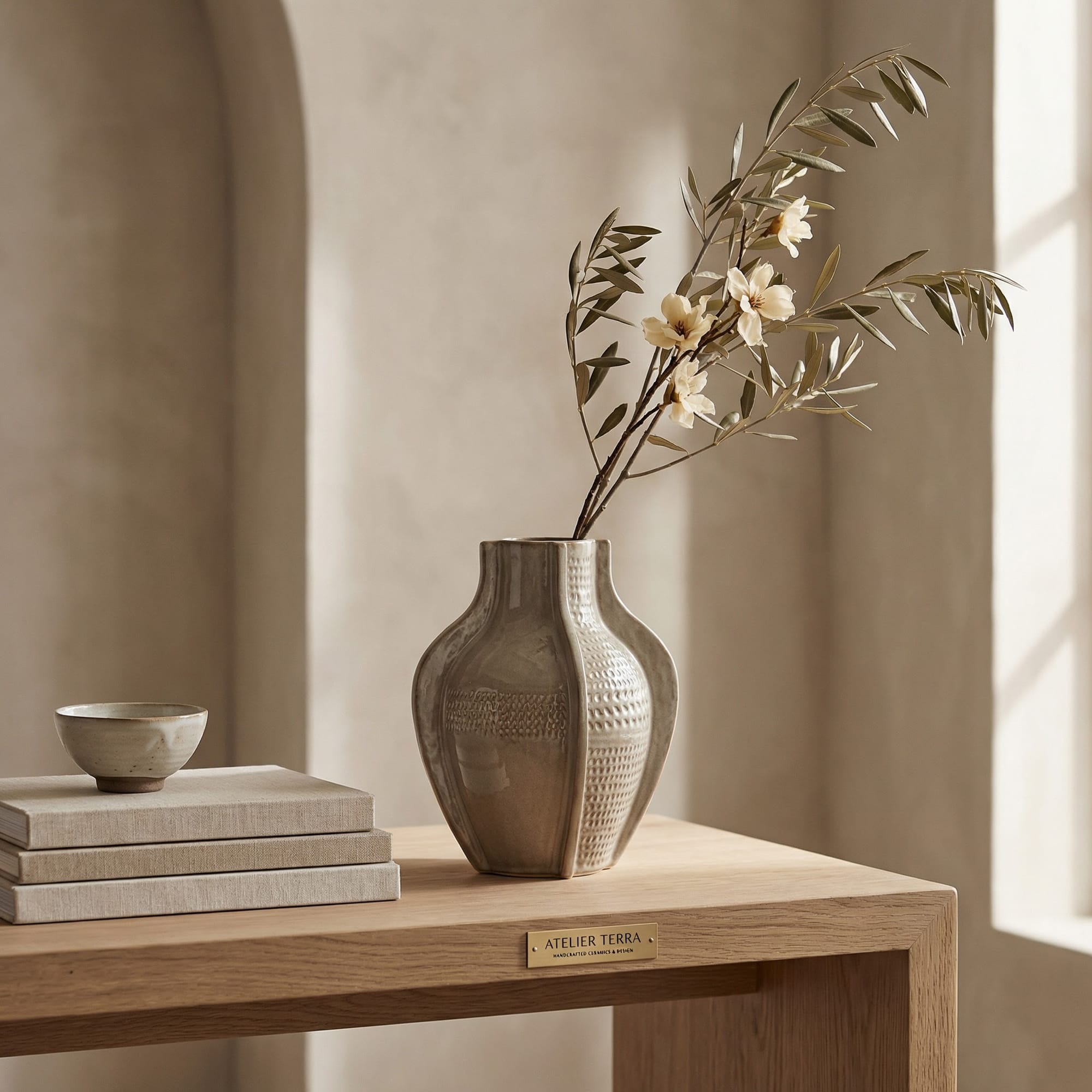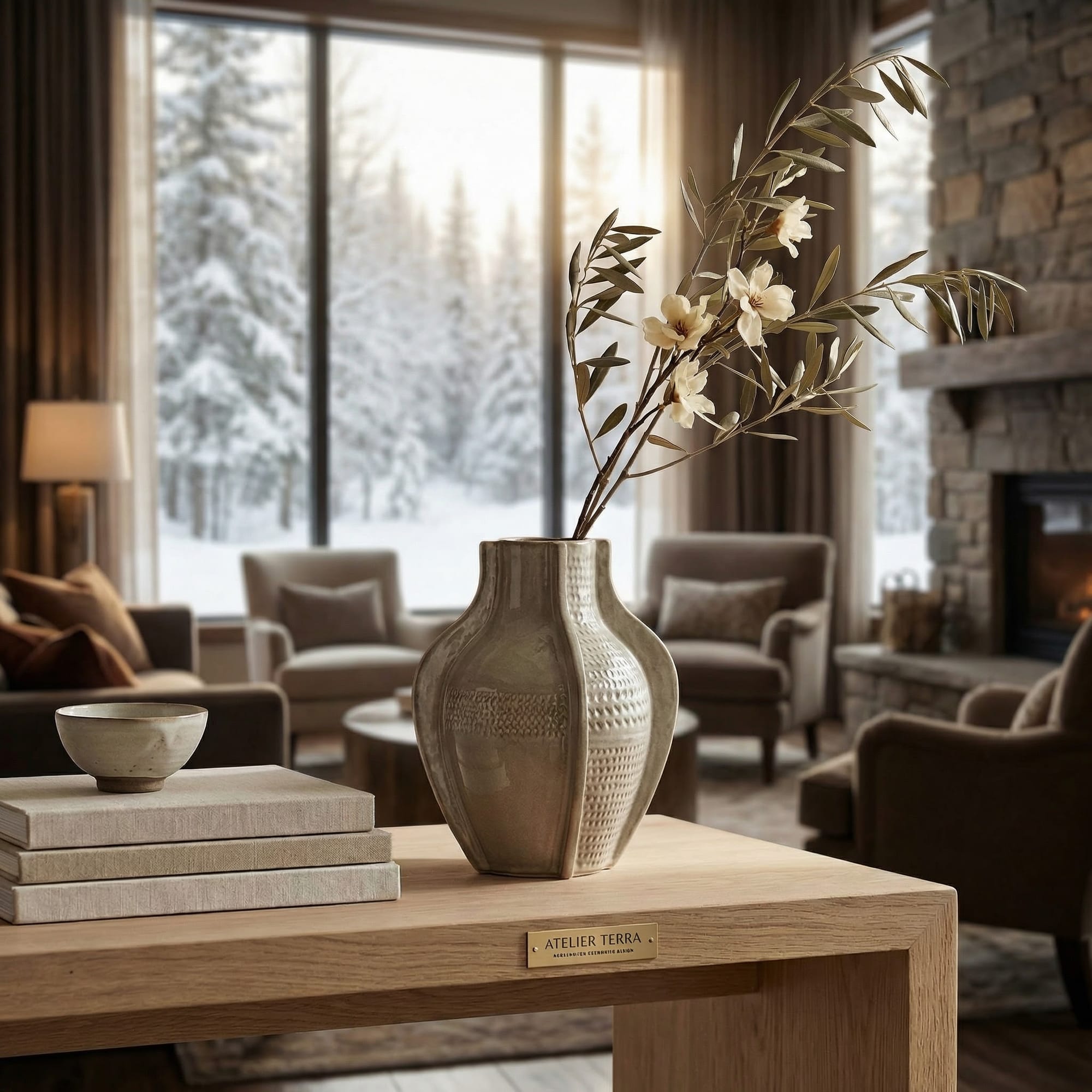 背景を、大きな窓から雪の積もった冬の森が見える高級ホテルのラウンジに変更してください。中央の商品(花瓶)とそれが置かれている机は一切変更せず、元の形状と質感を完全に維持してください。自然な逆光が差し込むように調整してください。