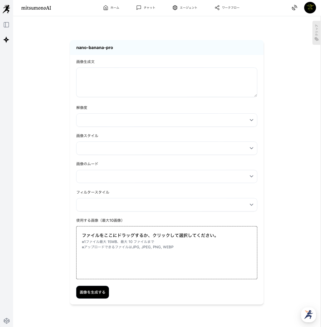 - 必要に応じて他の項目(解像度、画像スタイル、ムード、フィルター)を選択し、「画像を生成する」をクリックします。