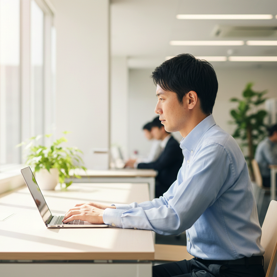 この男性の顔と髪型の範囲のみを、別の30代の清潔感のある日本人男性に変更してください。座っているポーズ、着ている服、および背景のオフィス環境は一切変更せず、元の状態を維持してください。