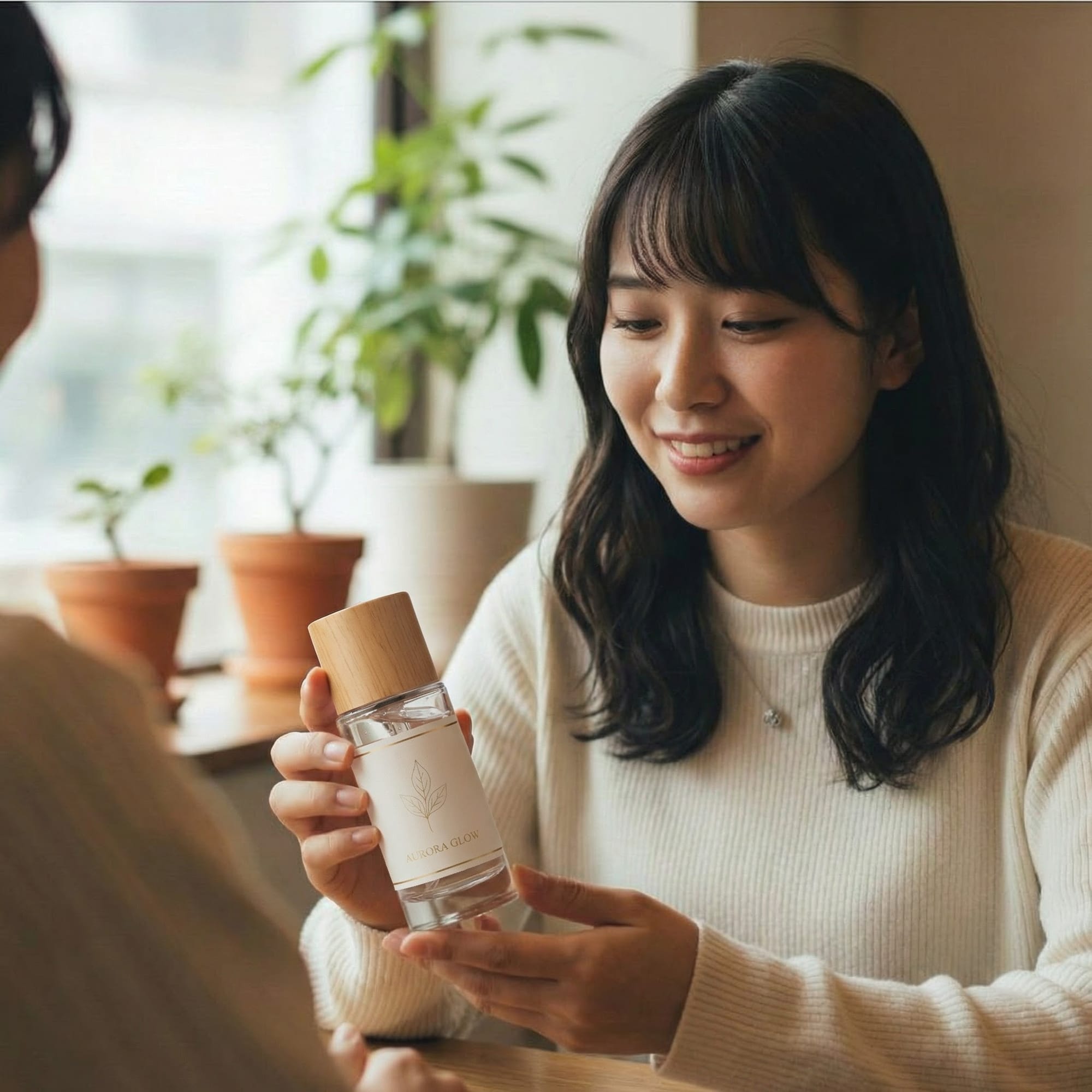 添付した画像『item』を、女性の手に自然に持たせてください。女性の服装、背景、および『item』自体の外観は一切変更せず、元の状態を維持してください。女性の表情は、手元の商品(item)を優しく見つめているように修正し、商品には周囲の光源に合わせた自然な影と反射を加えてください。指定した箇所以外は一切変更しないでください。