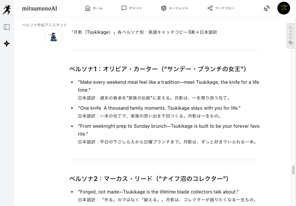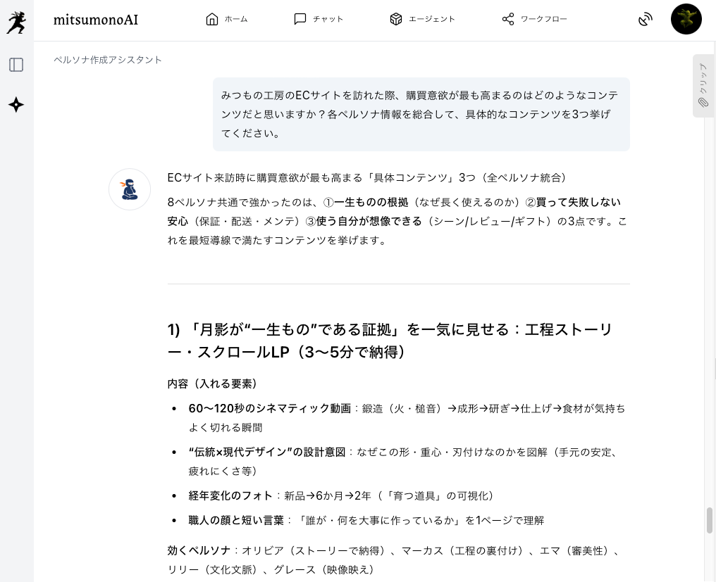 AIとのチャットで、生成したペルソナに基づいたさらなる指示を出します。