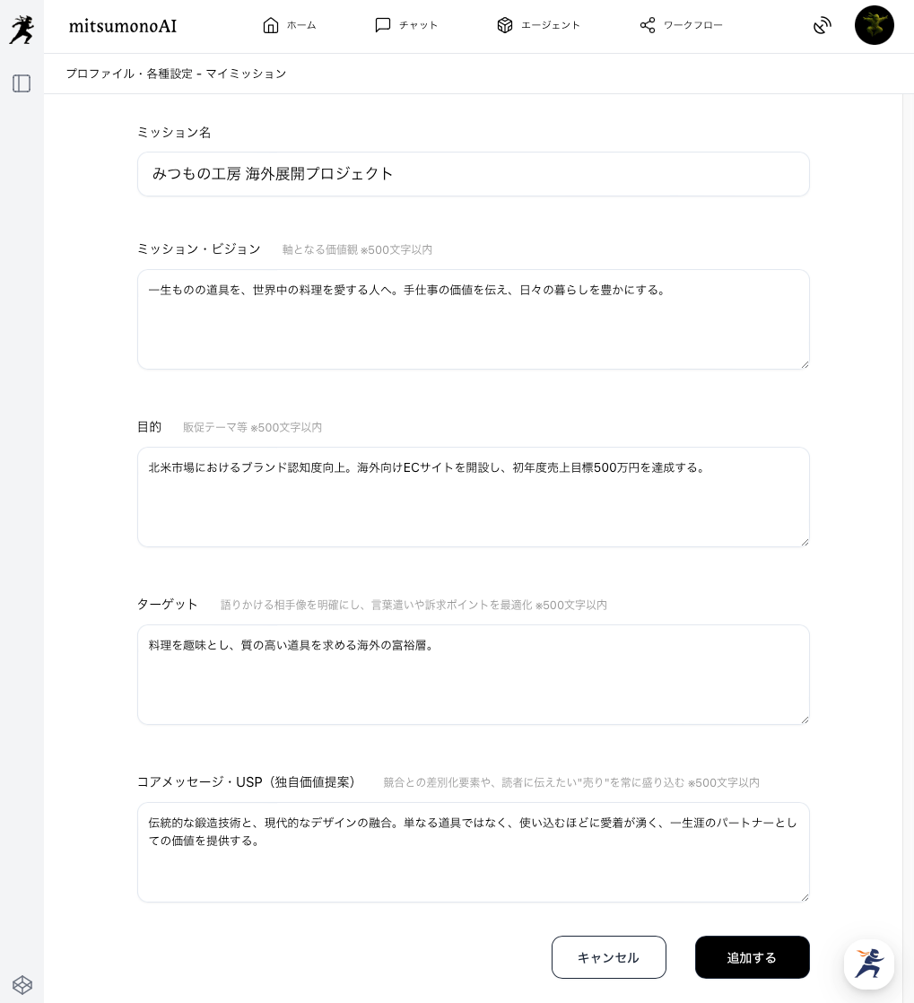 - ミッション選択:プルダウンから、STEP 1で作成した「みつもの工房 海外展開プロジェクト」を選択します。