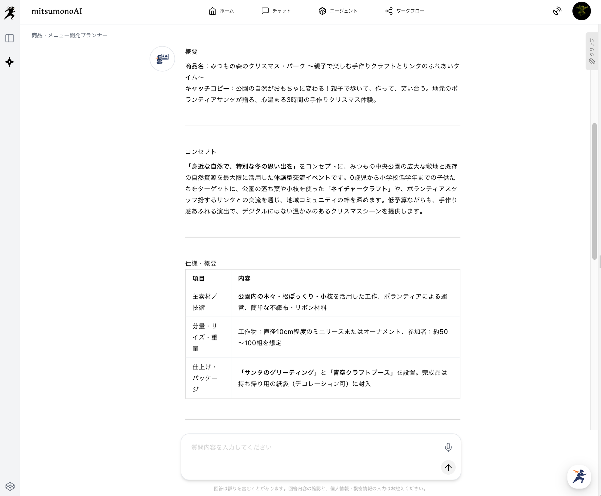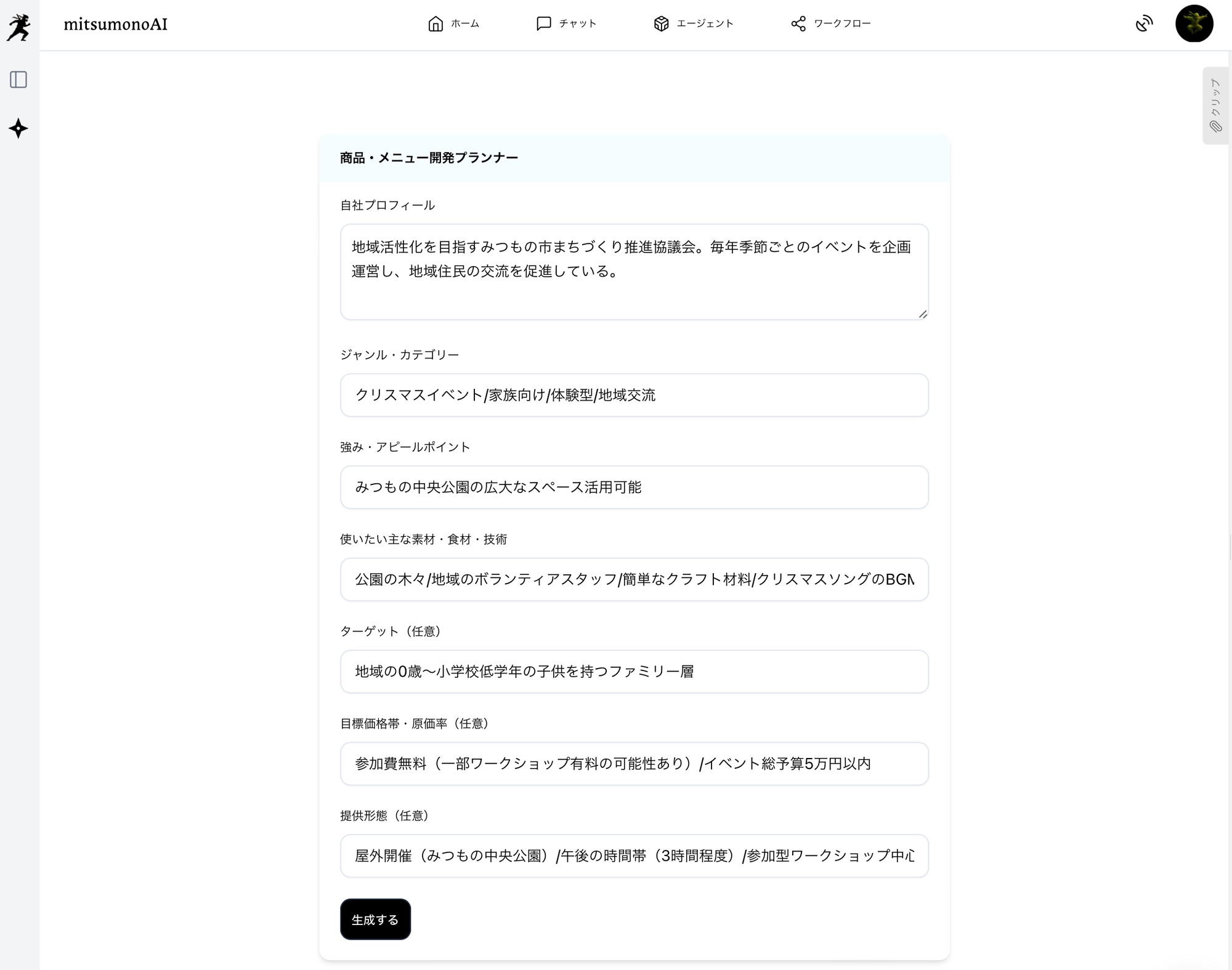 「商品・メニュー開発プランナー」は、ターゲットや予算、素材などの条件から、新しい商品やメニューのアイデアを生成する機能です。「イベント」もまた、参加者に対して特定の「体験」という『商品』を提供するものです。この考え方を応用してこの機能を使用すると、