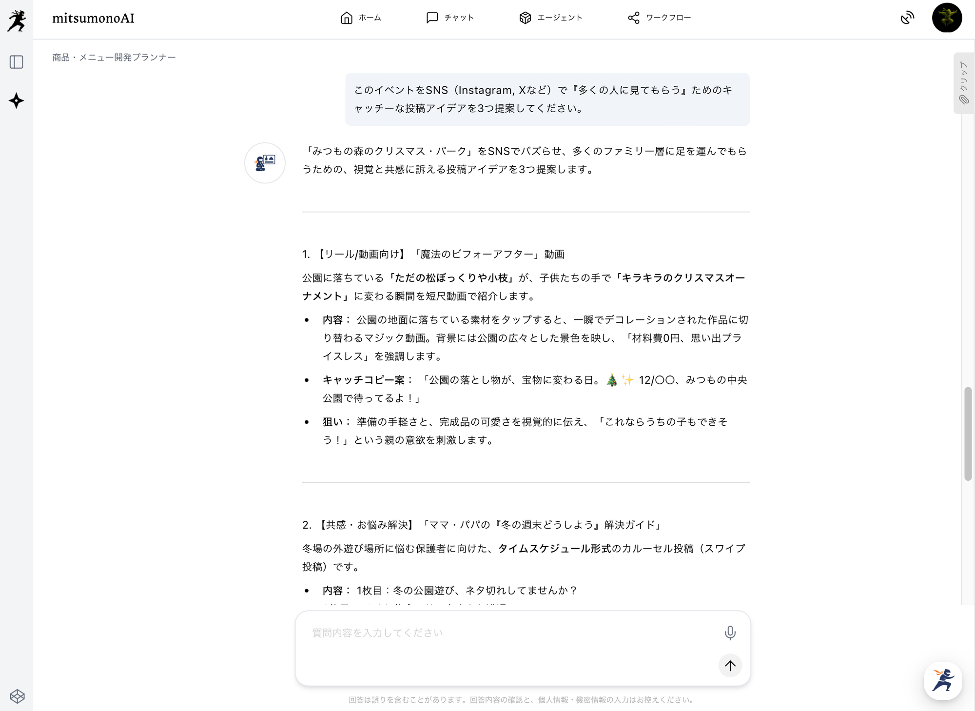 この記事では、本来は商品やメニュー開発をサポートするmitsumonoAIの「商品・メニュー開発プランナー」を、「イベント」という『商品』を企画するためのツールとして応用し、予算内で多くの参加者を集める斬新なイベントを生み出す具体的な方法をご紹介します。