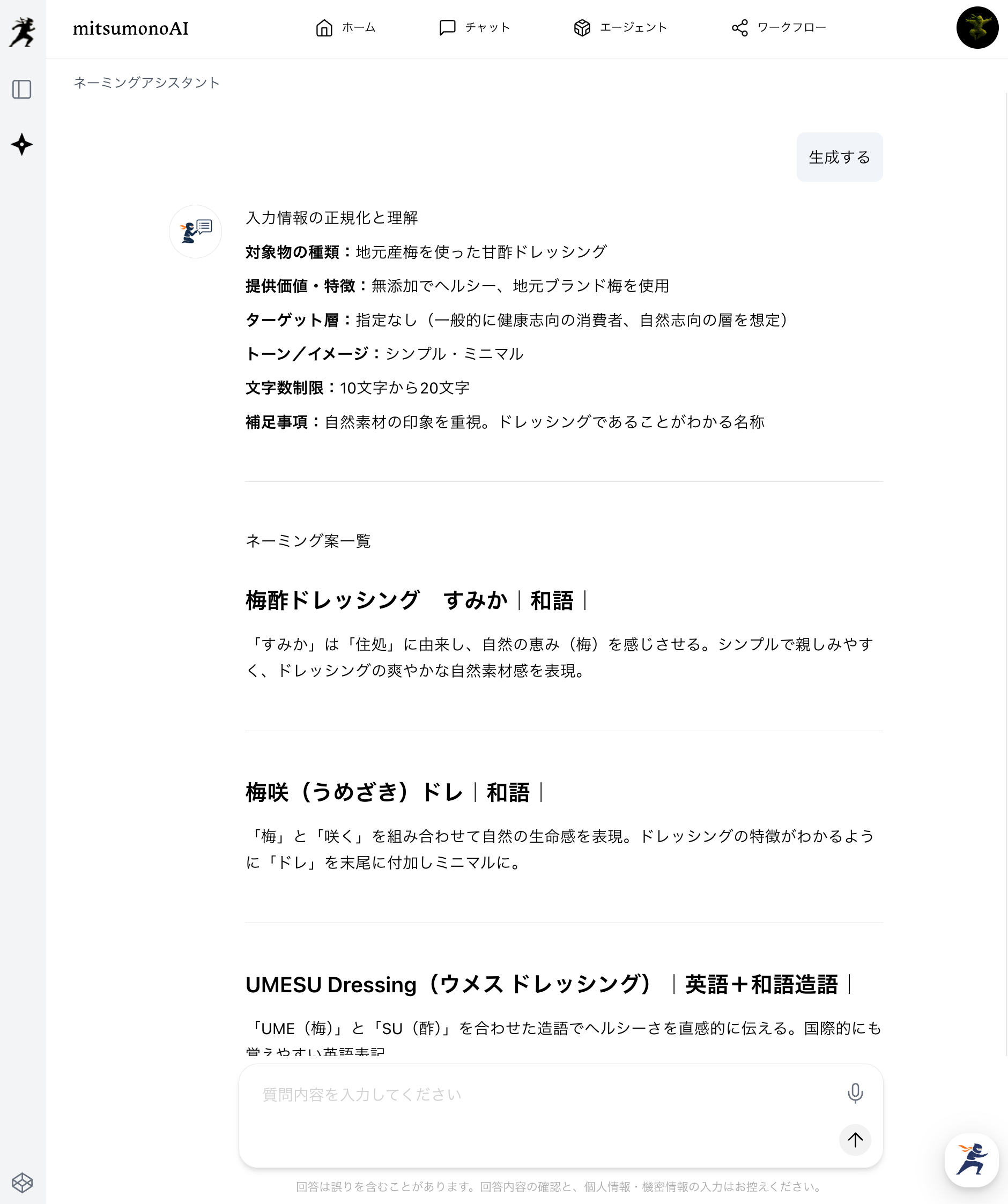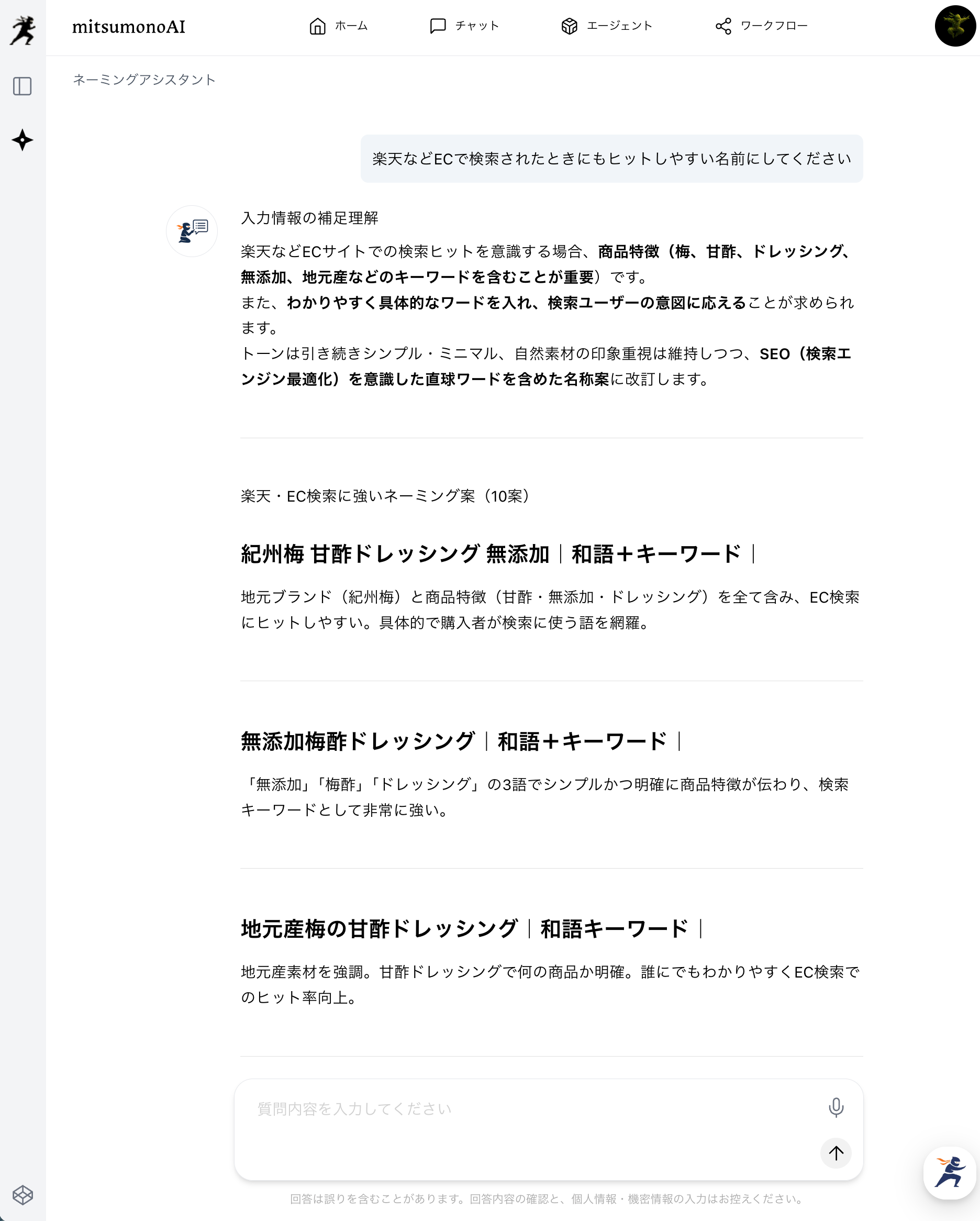 AIが提案する商品名を見ながら、以下のような質問をすることで、より理想的な名称に近づけていくことができます。
