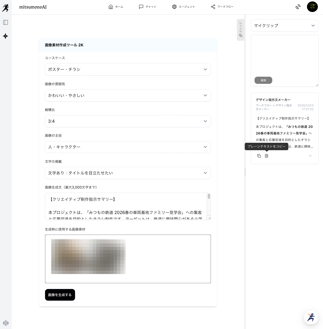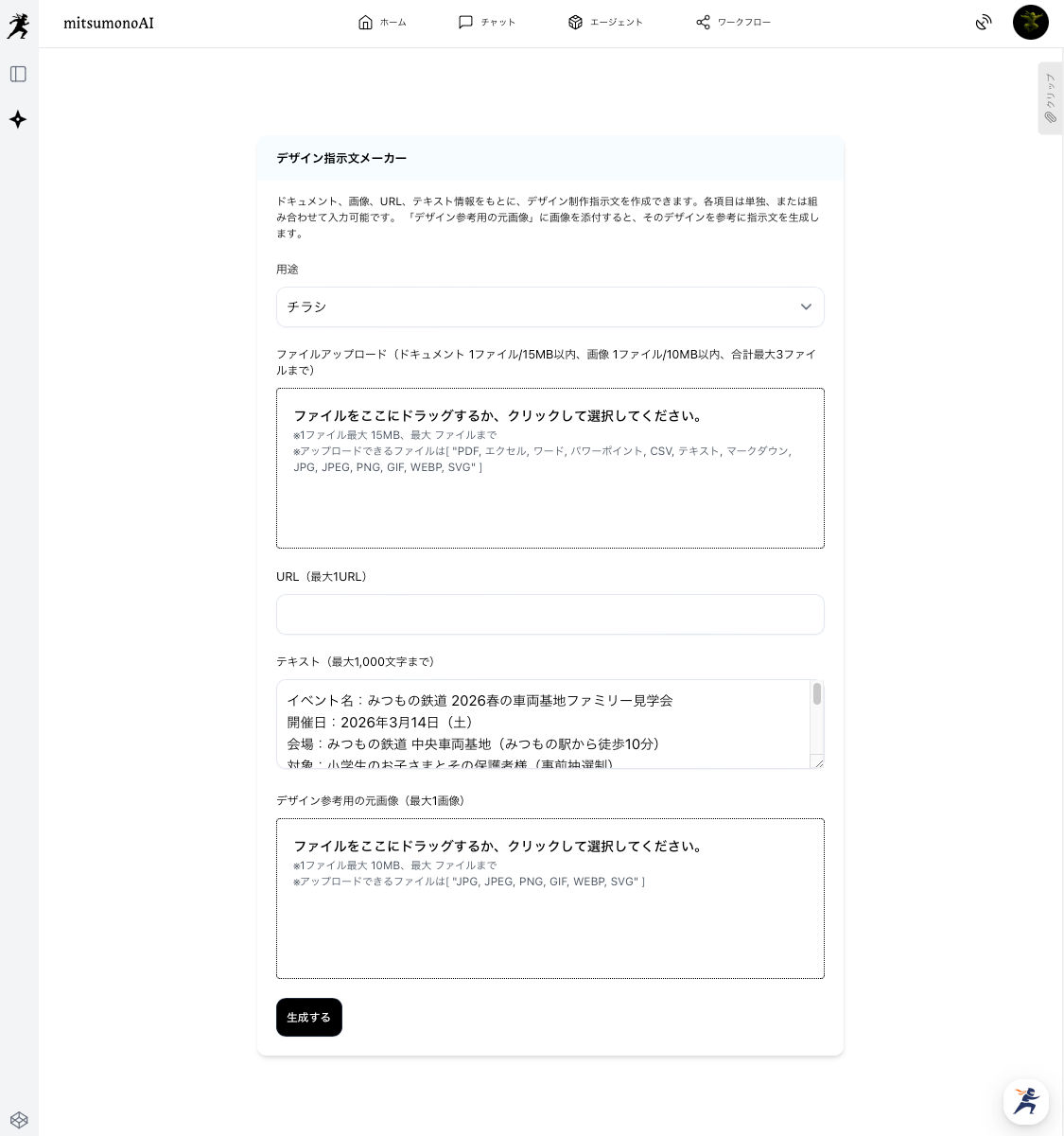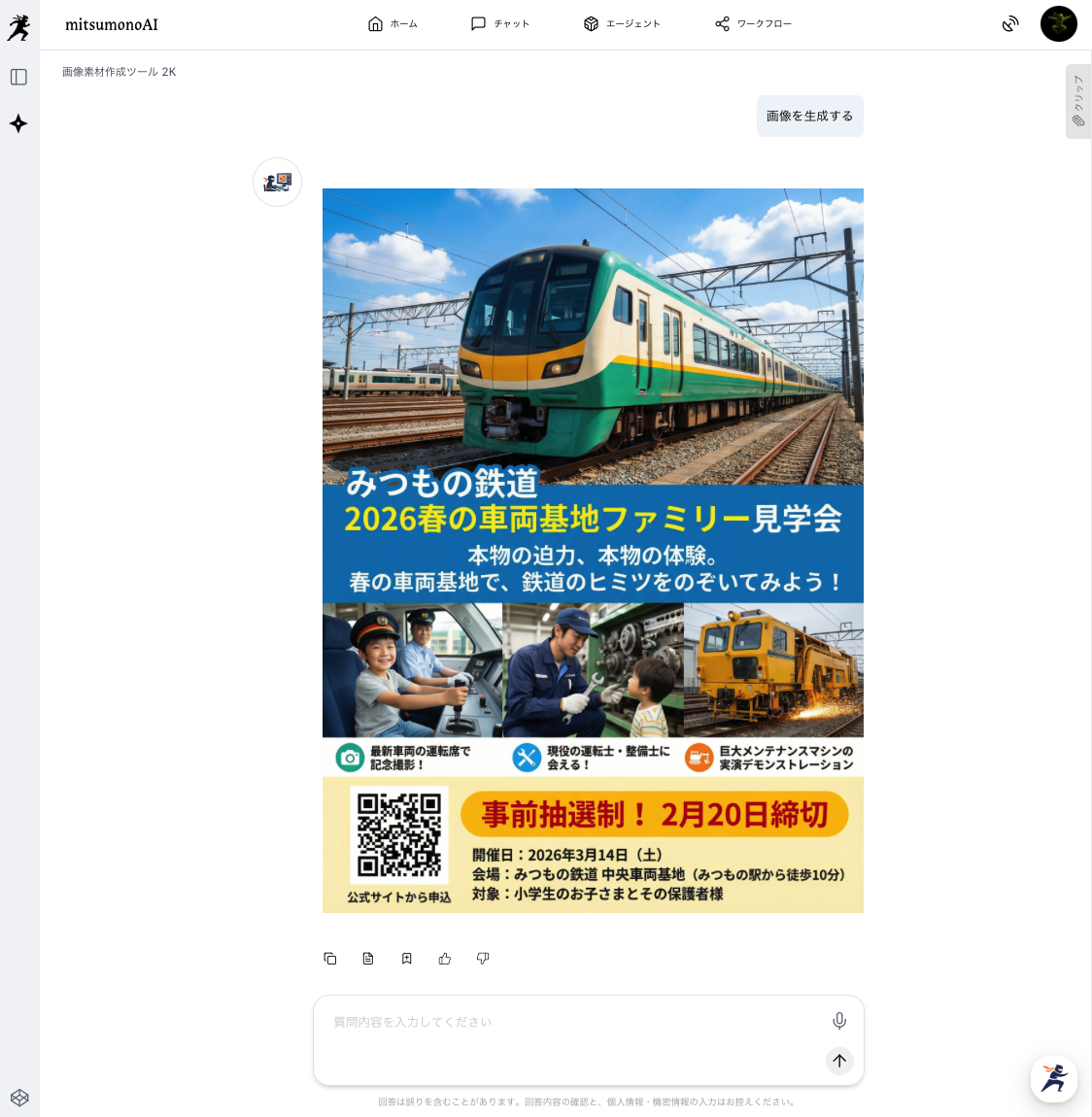 これまで、車両基地イベントのような特殊な環境を魅力的にチラシ化するには、多大なコストと調整が必要でした。しかしmitsumonoAIを活用すれば、担当者の想いをAIが即座にプロフェッショナルなビジュアルへと変換してくれます。