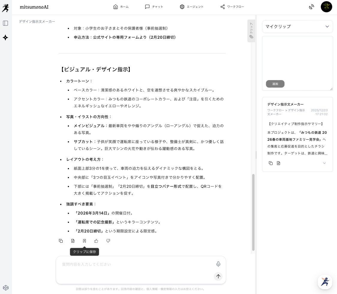 AIは、車両の力強いイメージと、スタッフとの交流という「人」の温かさを組み合わせた指示を出します。この指示文をクリップに保存して、次のステップへ進みます。