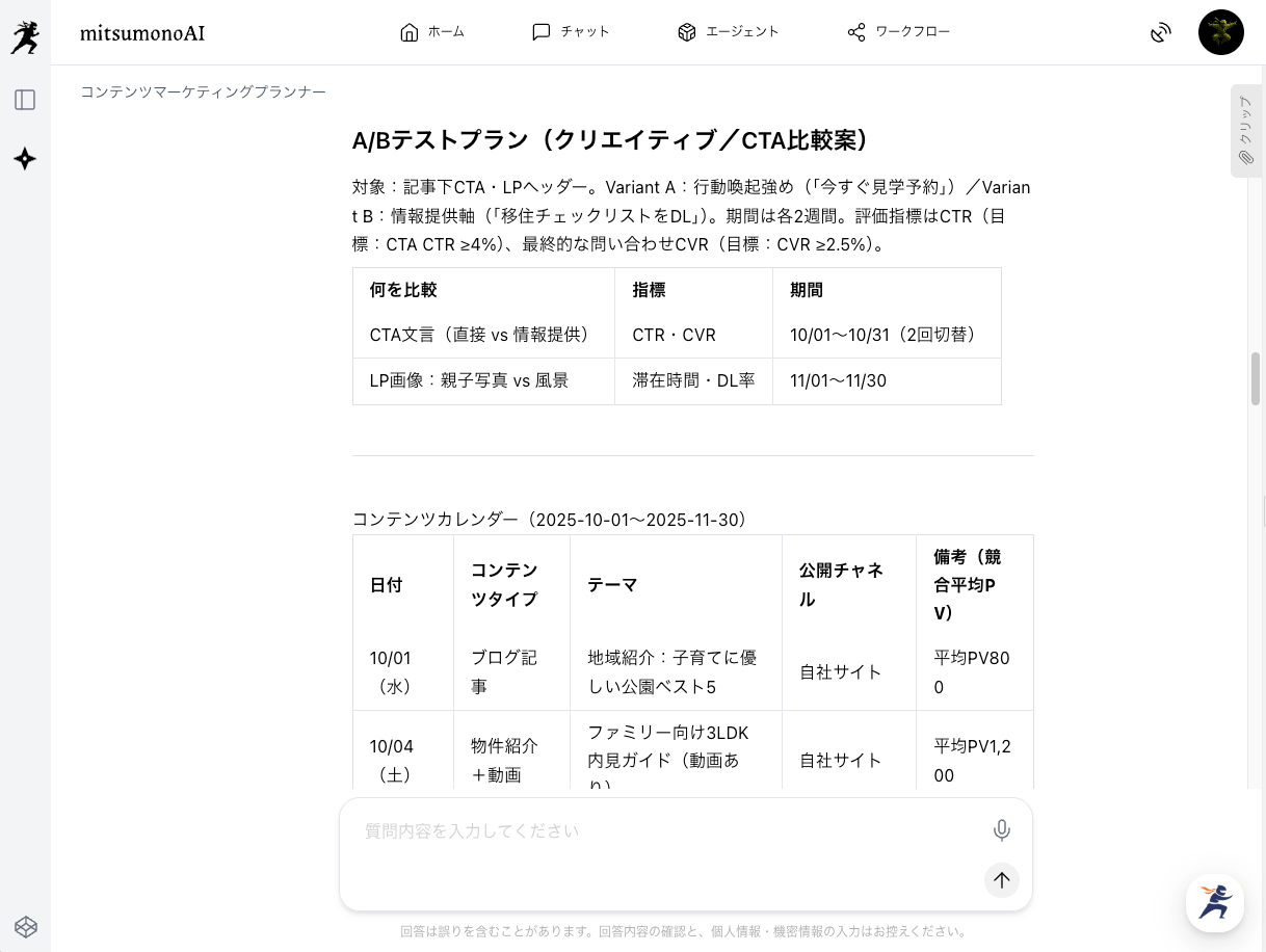 このようにAIの提案から選択したり、修正を指示するだけで、ミッションに定義されたターゲット(都心から移住を検討中のファミリー層)のインサイトを的確に捉えた、質の高い記事が生成されます。