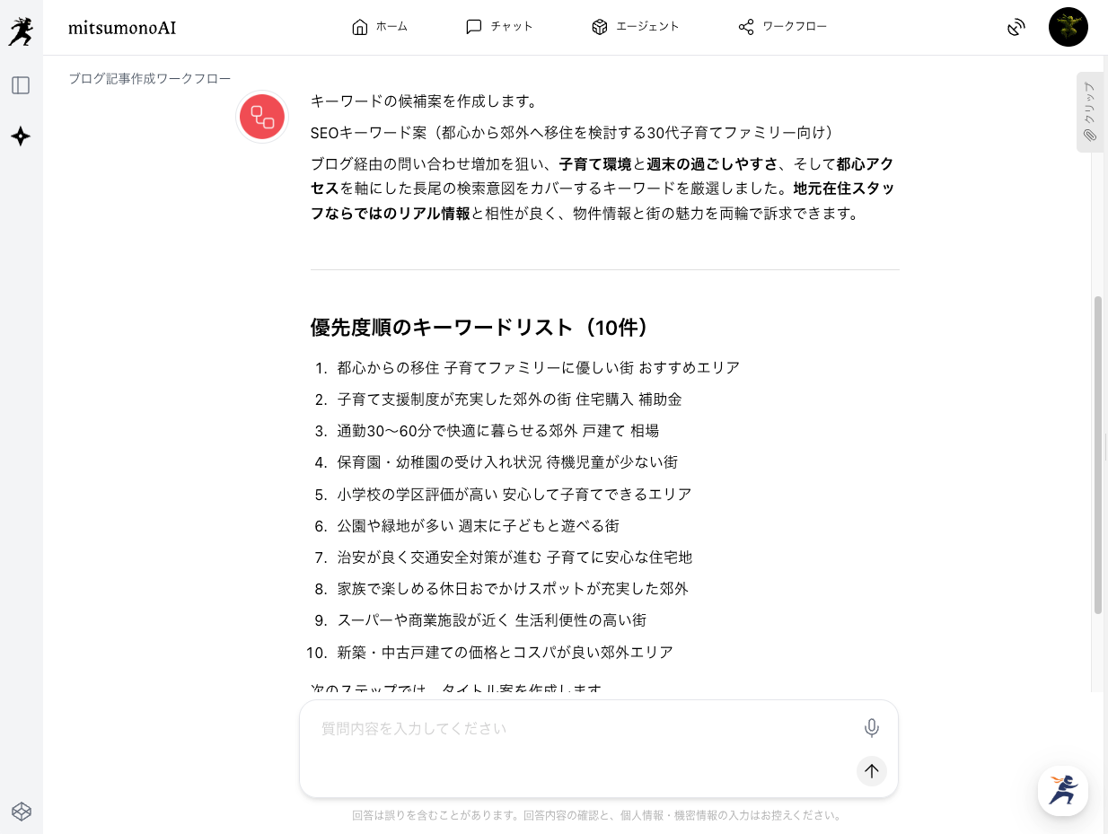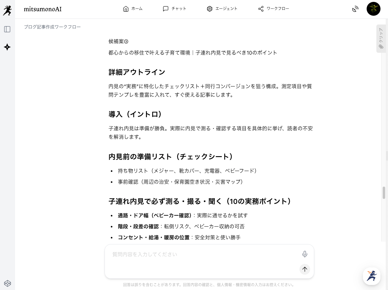 ブログ記事作成ワークフローは、以下のように記事を生成します。