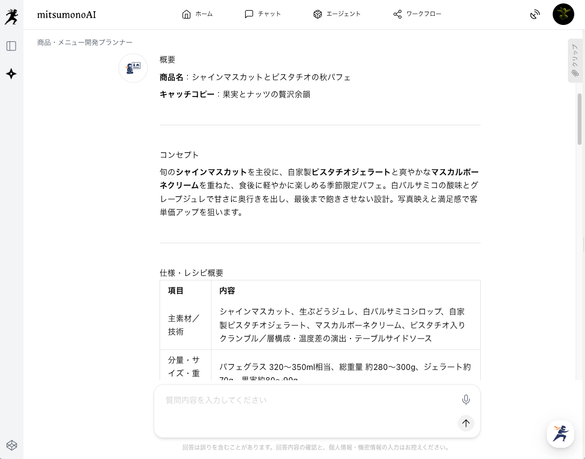 「シャインマスカットとピスタチオの秋パフェ」という具体的なメニューが提案されました。