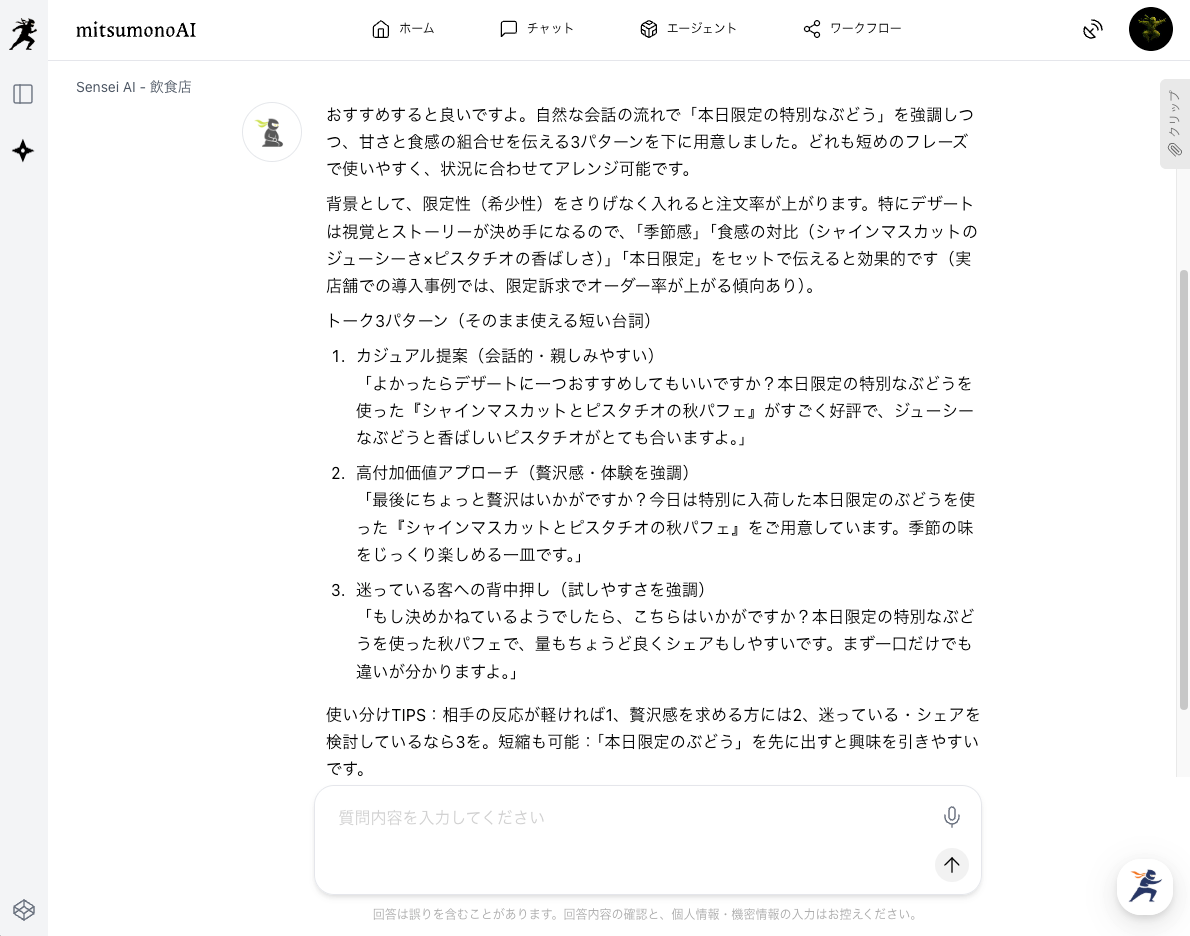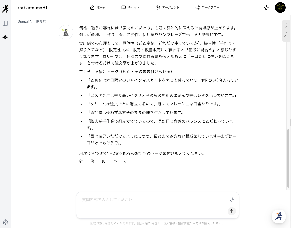 分析結果(例:「パフェは美味しいが、少し値段が高いという意見が散見される」)を基に、再度Sensei AIに相談します。