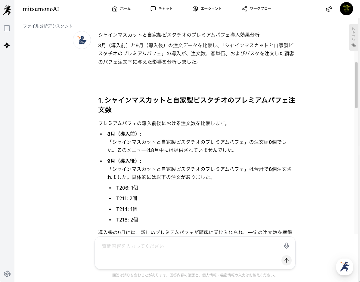 「8月(導入前)と9月(導入後)の注文データを比較し、『シャインマスカットと自家製ピスタチオのプレミアムパフェ』の注文数と、それに伴う客単価の変化を分析してください。特に、パスタを注文した顧客のパフェ注文率がどう変わったか教えてください。」