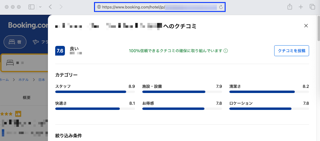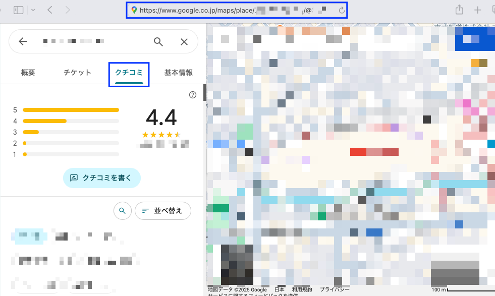 口コミ情報が表示されているページで、ブラウザのアドレスバーに記載されているURLをコピーします。