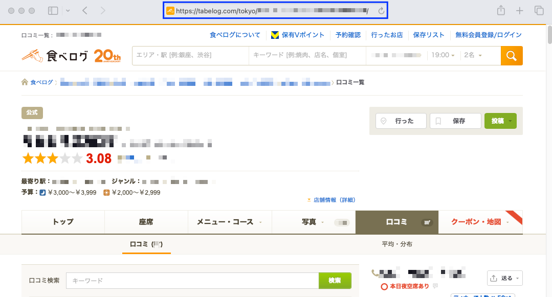 まず、分析したい口コミが掲載されているグルメ情報サイト(例:食べログ)にアクセスします。 - 店舗の検索