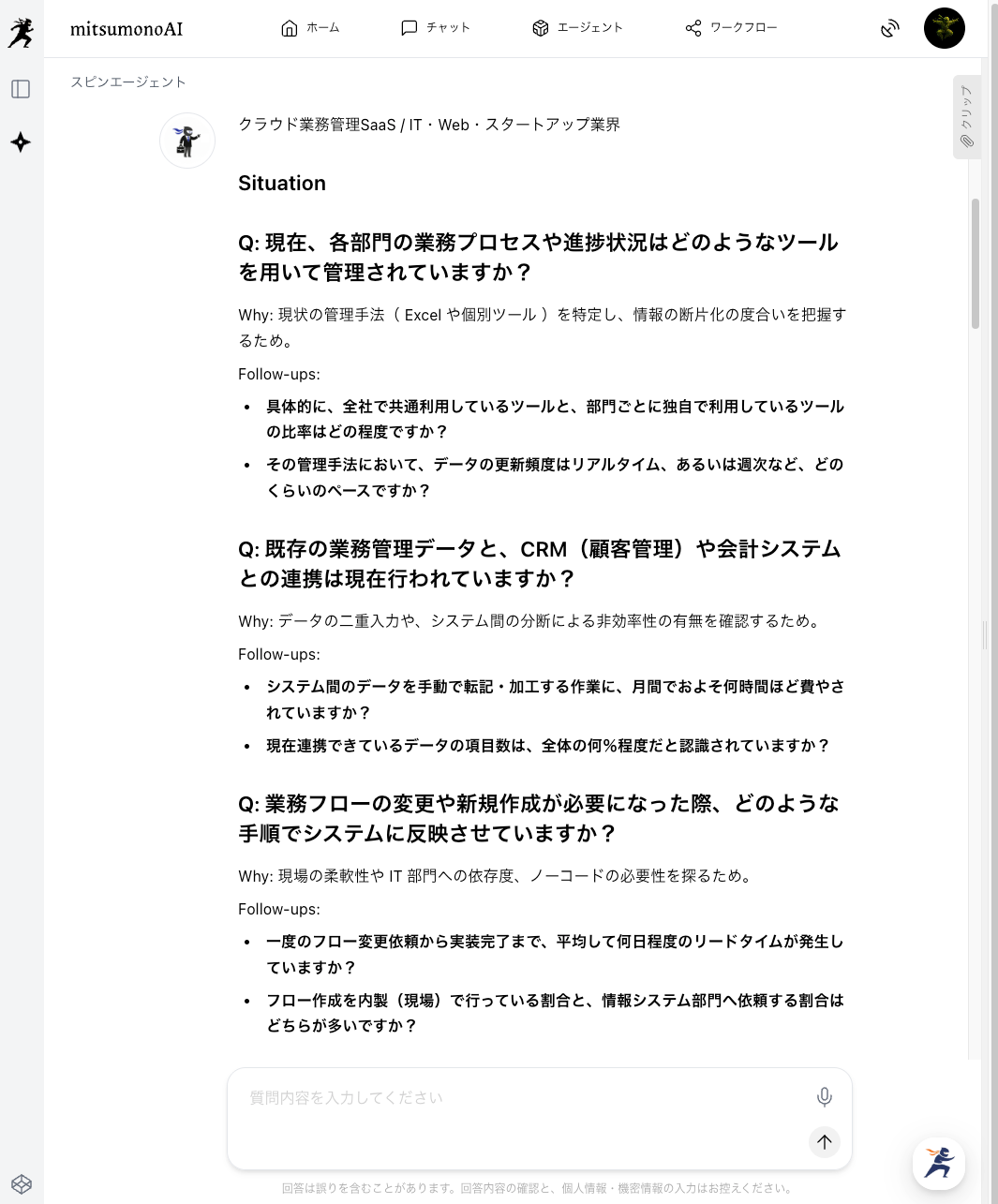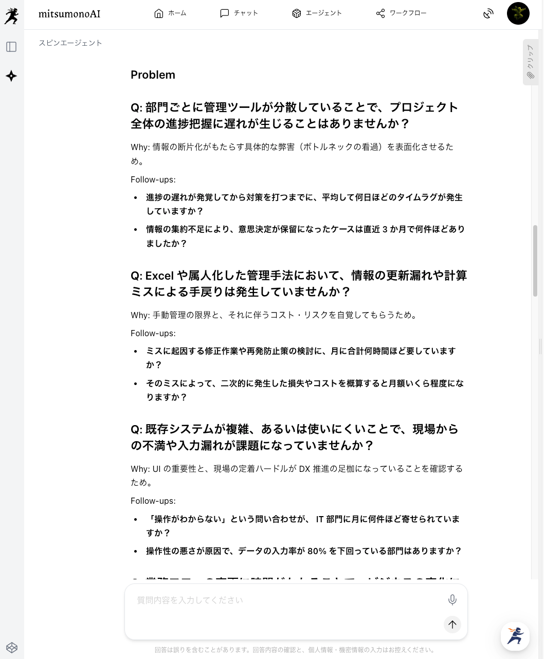 その質問によって、顧客のどのような課題(例:現場の柔軟性への不満)を探るべきかの意図を理解できます。 - Follow-ups(追加の問い):