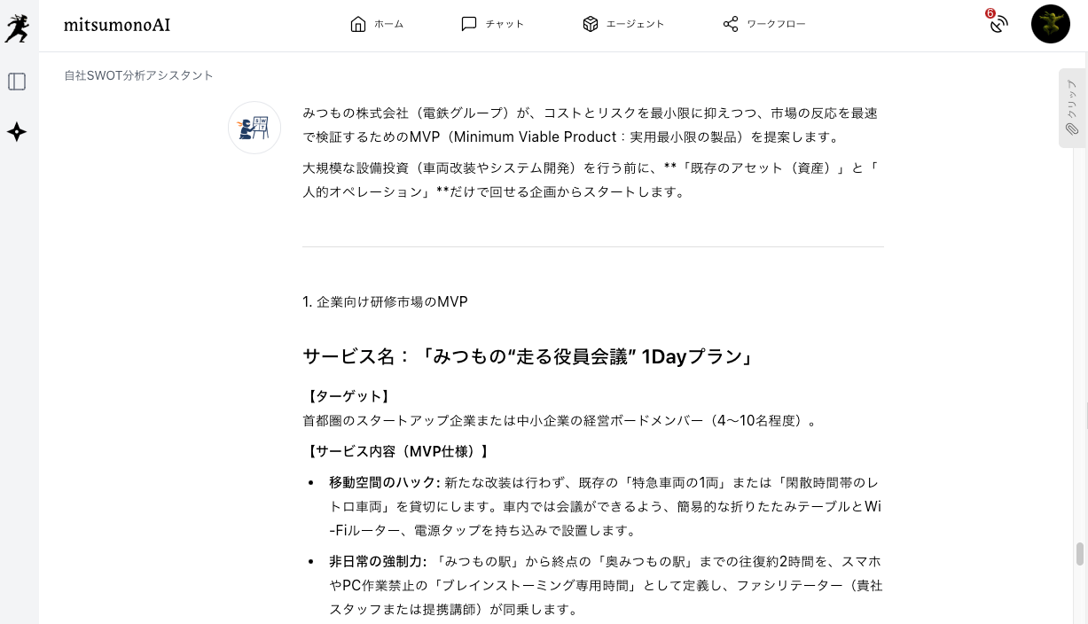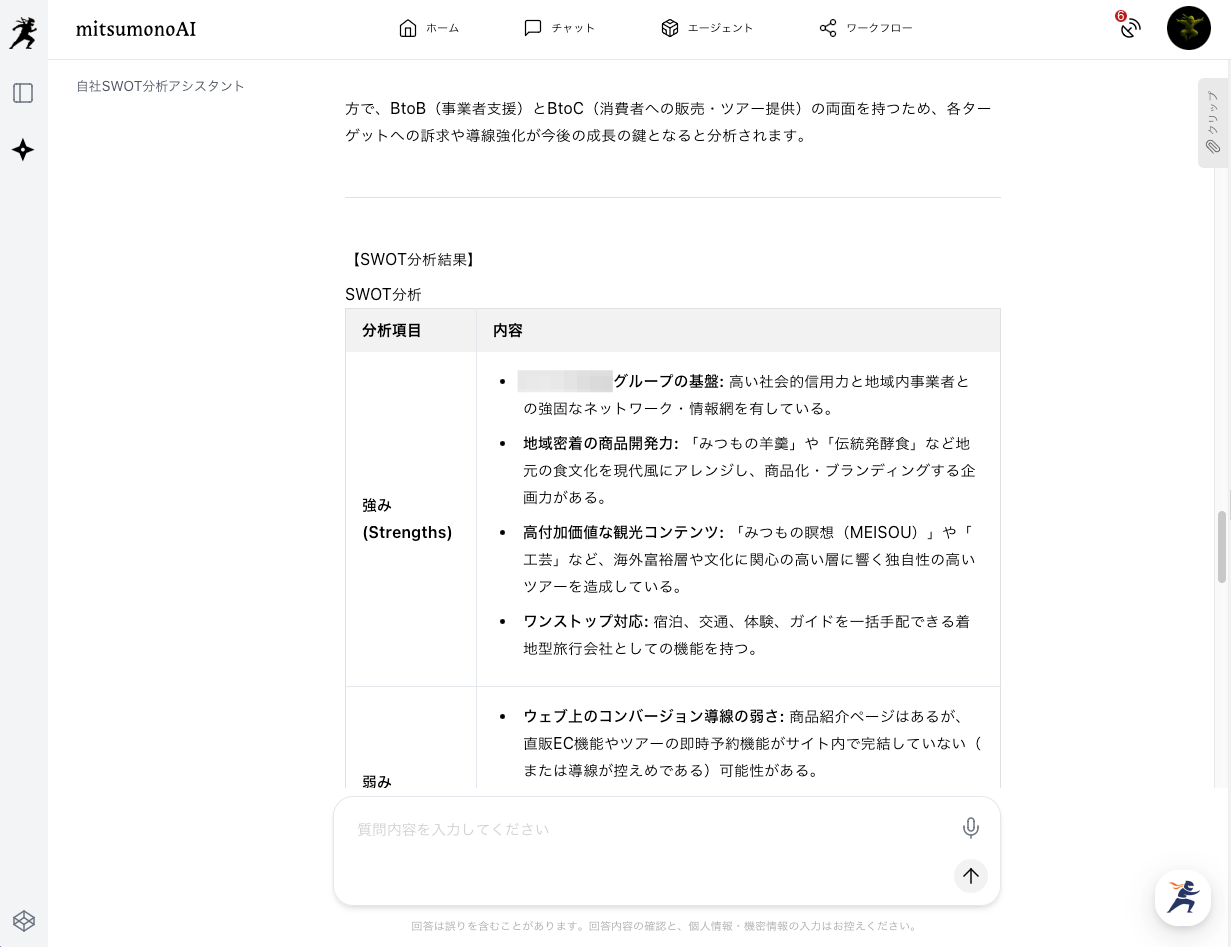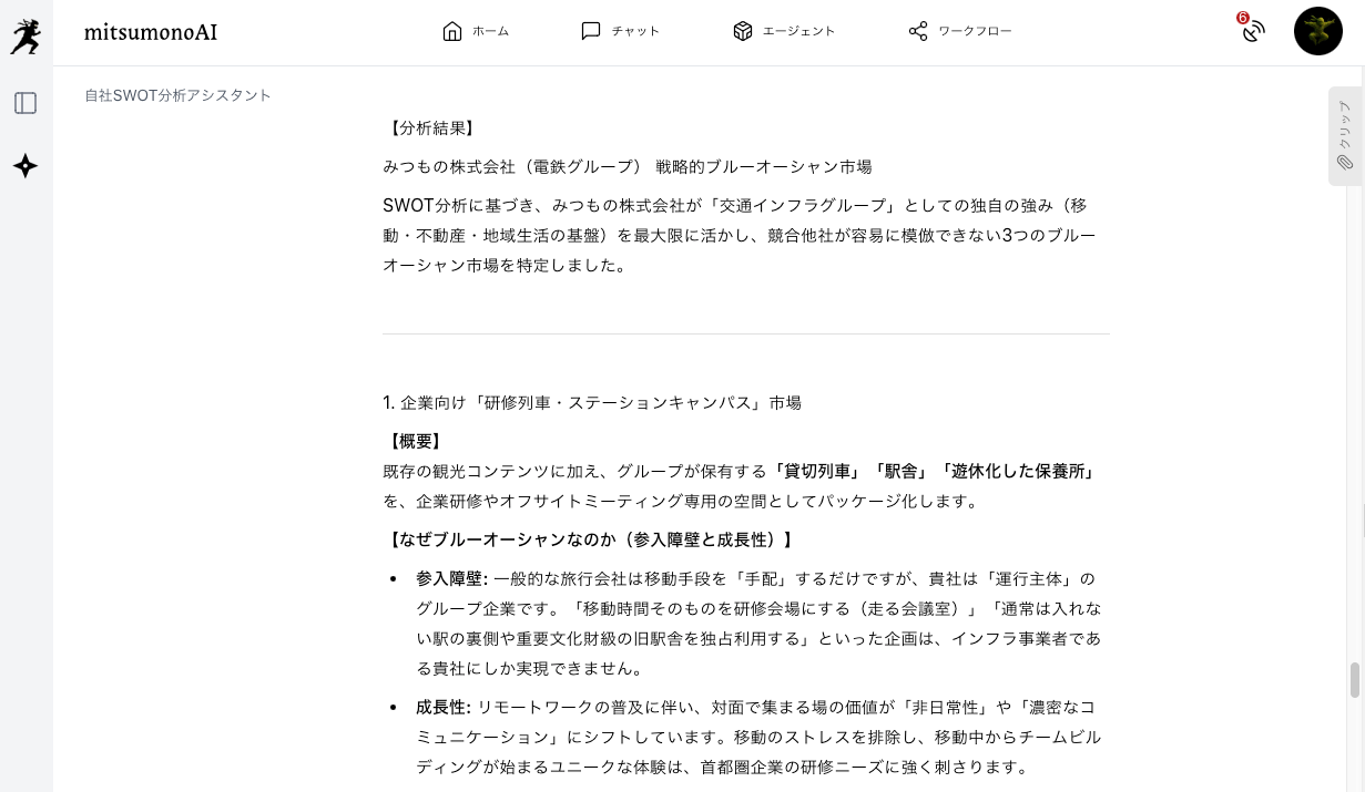 mitsumonoAIの「自社SWOT分析アシスタント」は、AIとの対話を組み合わせることで、競合のいない新たな市場を発見し、自社の未来の事業を創造するための強力な出発点となります。