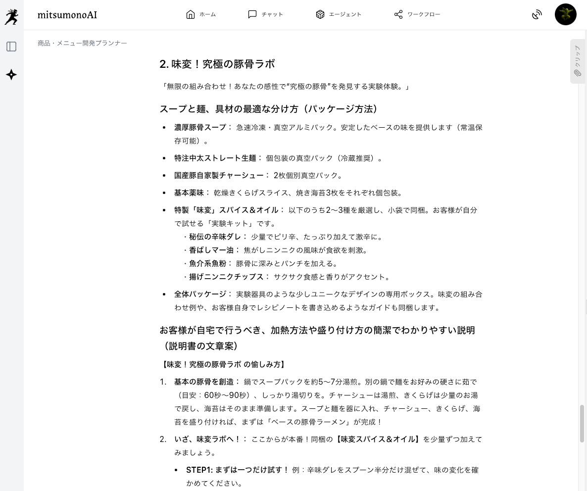 この指示により、AIは「無限の組み合わせ!あなたの感性で“究極の豚骨”を発見する実験体験」のような具体的な提案を、パッケージングや説明書の文案まで含めて返します。