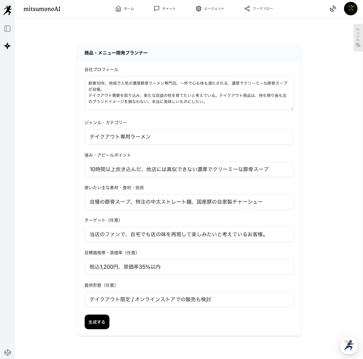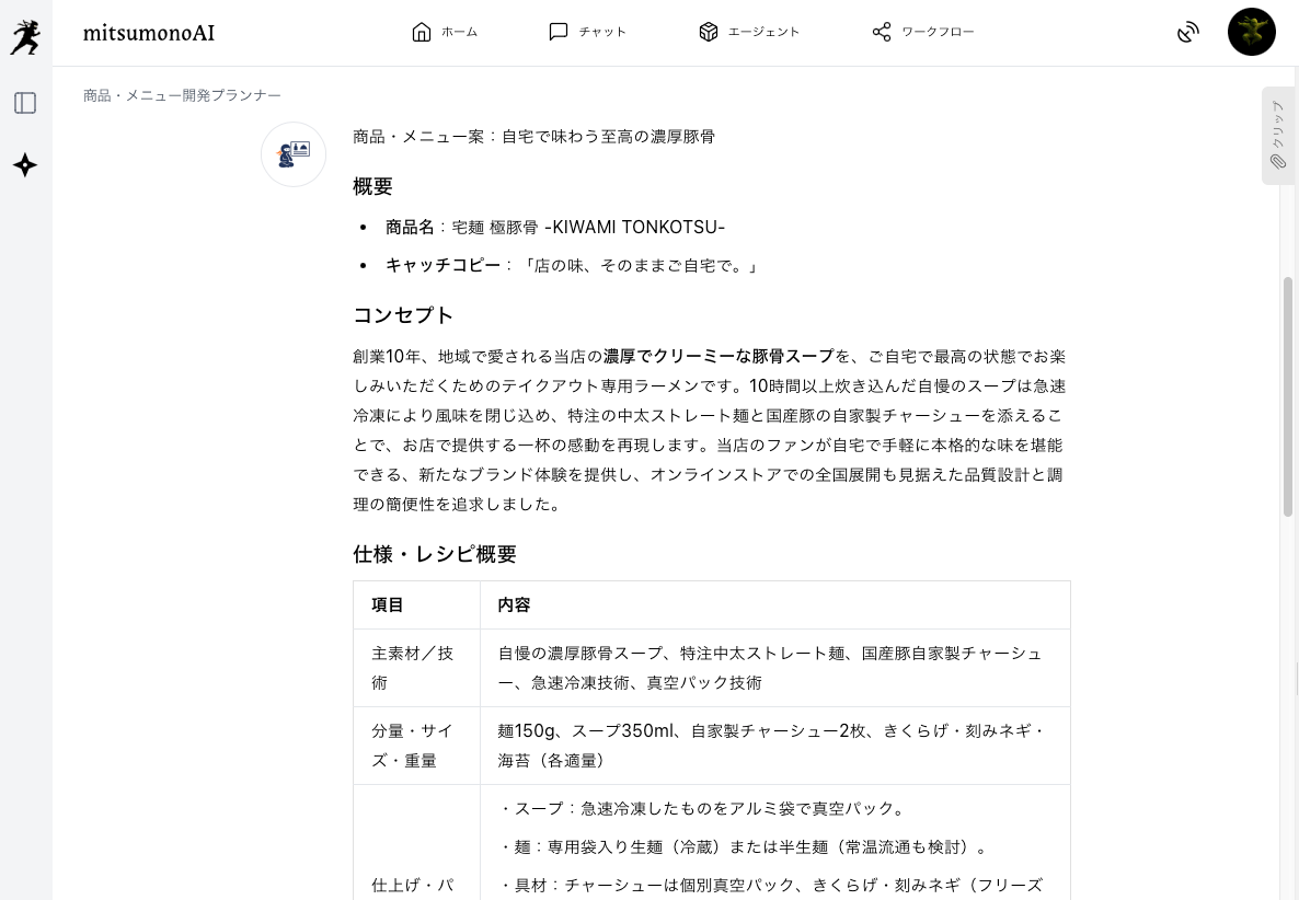 「生成する」ボタンを押すと、入力された情報に基づき考案された商品・メニュー案が出力されます。