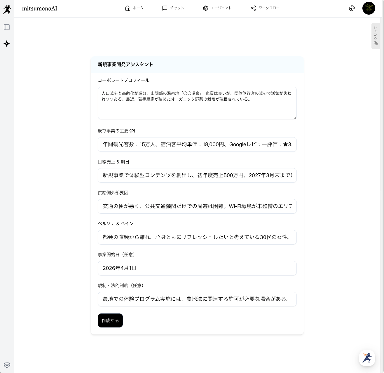 まず、あなたの頭の中にある漠然としたアイデアや、地域が持つ資源をAIに入力し、事業の「骨格」となる計画のたたき台を作成します。