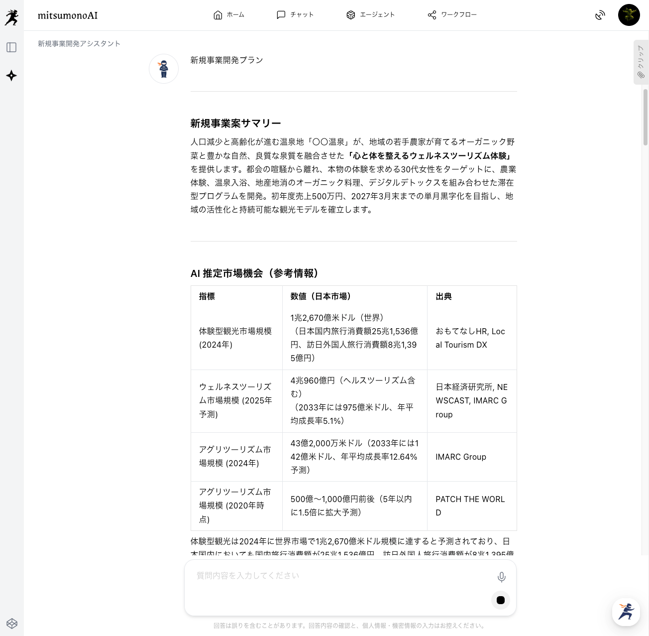 このステップにより、「温泉」と「オーガニック野菜」という地域資源を組み合わせた、「農泊体験付きウェルネス・リトリート」といった事業コンセプトの骨子が、リスクや課題と共に客観的に提示されます。