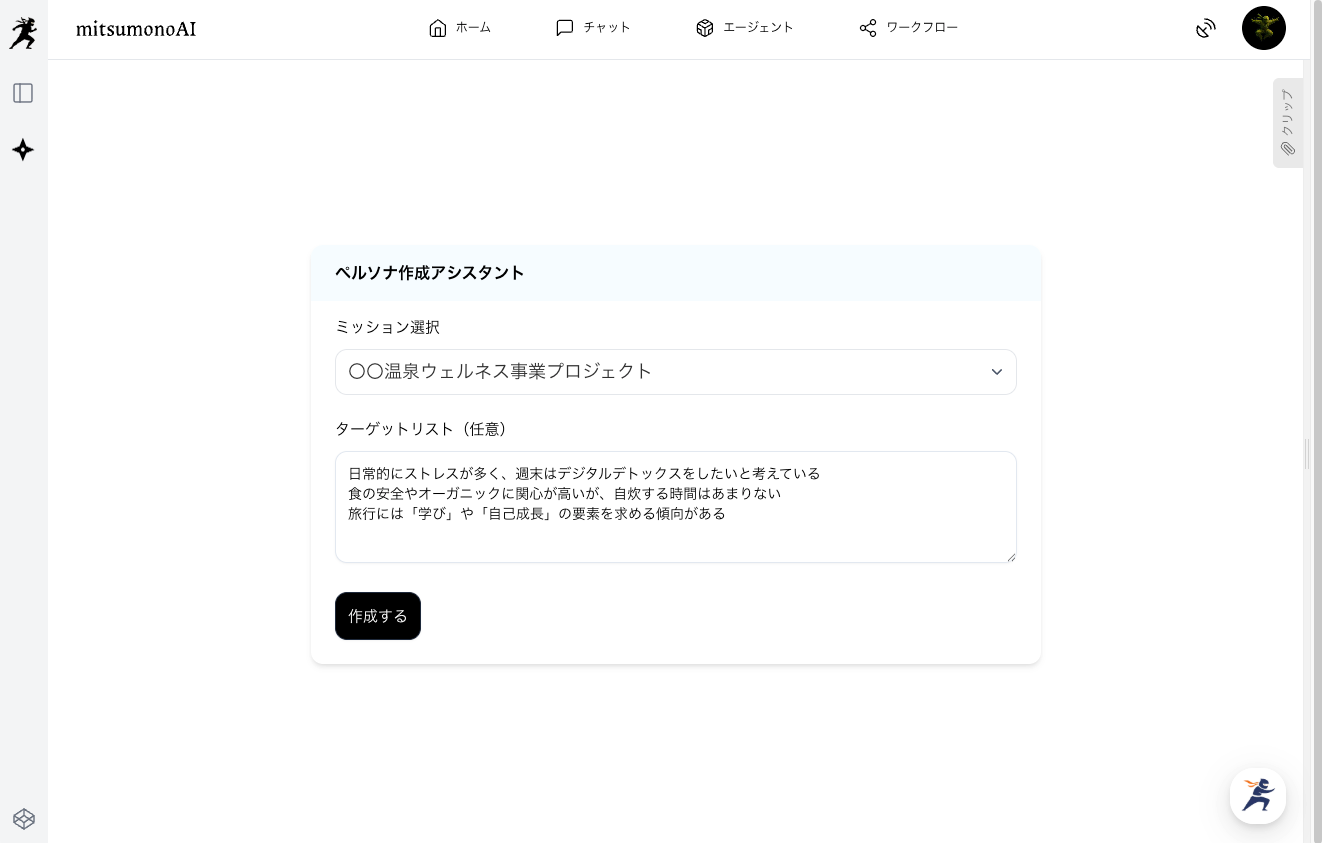 作成したペルソナが日常的に利用しているであろうSNS(Instagramなど)を推測し、投稿案作成ワークフローを使って、そのペルソナの心に響く写真やキャッチコピーのアイデアを生成する。 - 関係者へのプレゼンテーション資料作成:
