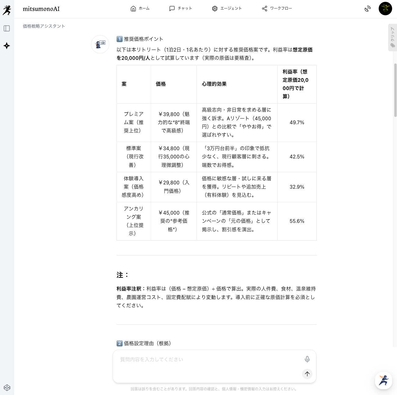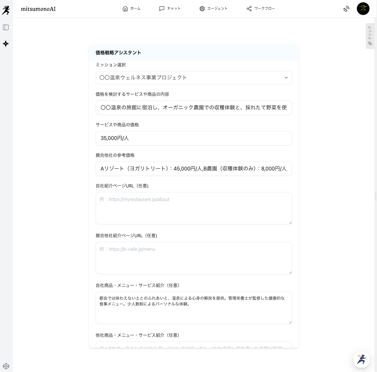 価格戦略分析アシスタントを起動し、ステップ1,2で具体化したサービス内容と、競合となりうる他の観光体験の情報を入力します。