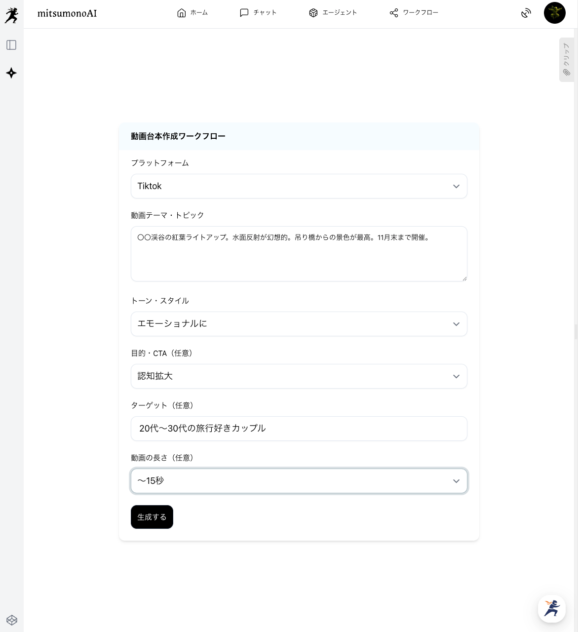 - プランナーで決めたテーマや、既に書いたブログ記事の内容を読み込み、TikTokやInstagramリールに最適化された「15秒尺の台本」を自動生成します。