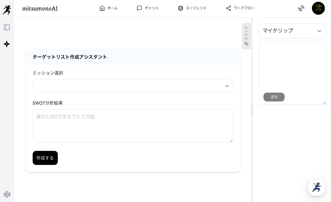- 情報連携と活用:クリップに保存した情報は、他の機能で再利用することができます。例えば、「自社SWOT分析アシスタント」で作成したSWOT分析結果をクリップに保存し、「ターゲットリスト作成アシスタント」の入力項目にクリップからペーストして活用するといった、シームレスな連携が可能です。