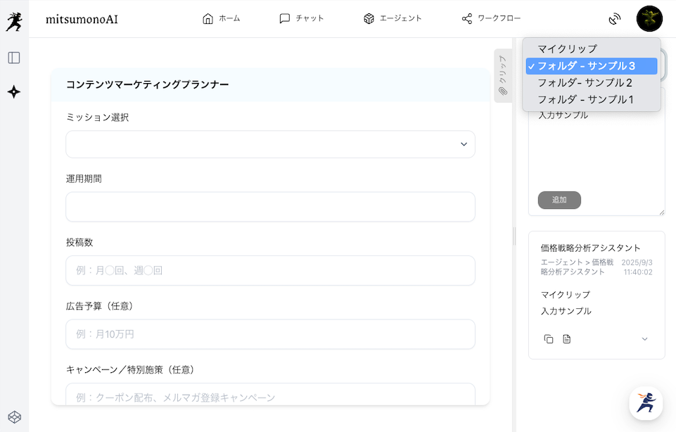 新しく追加された「クリップ機能」は、mitsumonoAIの各種アシスタントが出力したテキスト情報や、ユーザーが入力した情報を一時的または永続的に保存し、後で簡単に参照・再利用できる機能です。