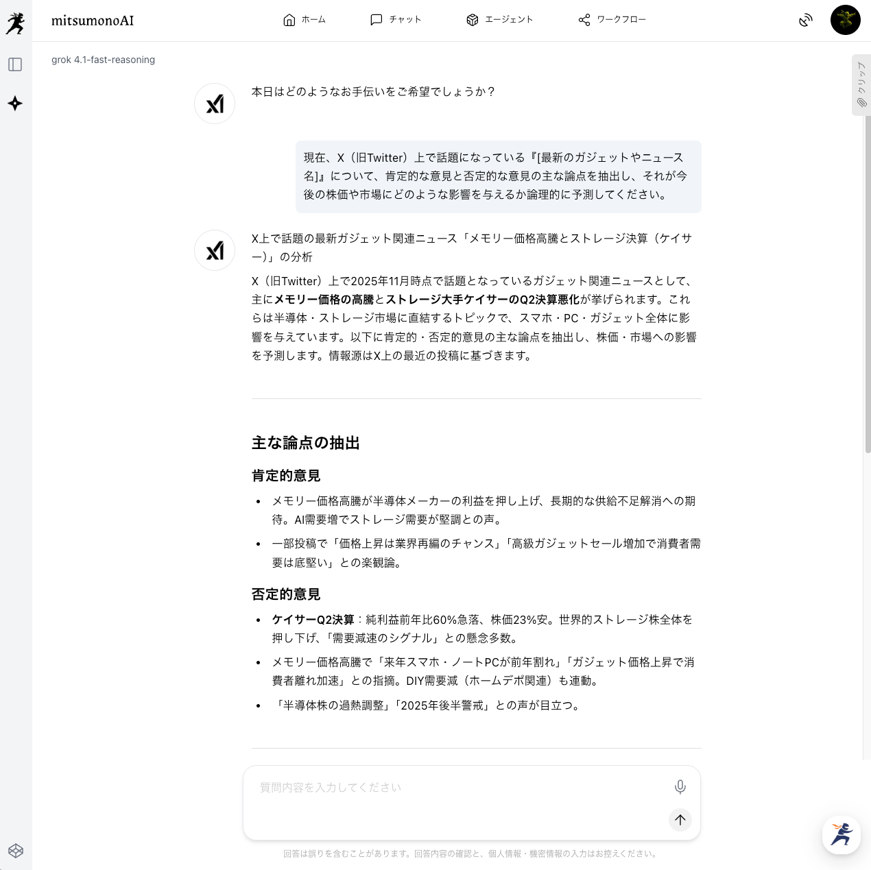 xAIの最新AIモデルより、速度とコストパフォーマンスに特化した「Grok 4.1-fast-reasoning」および「Grok 4.1-fast-non-reasoning」をmitsumonoAIに搭載いたしました。