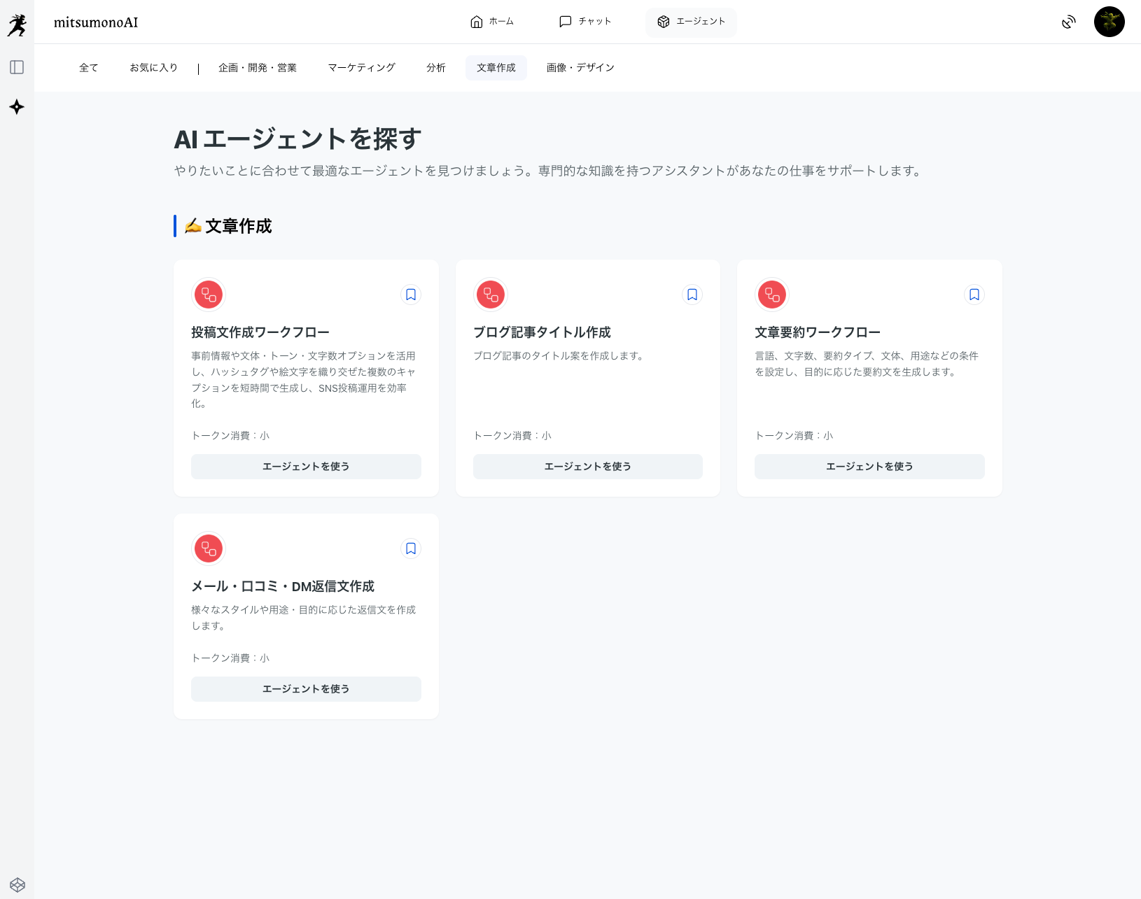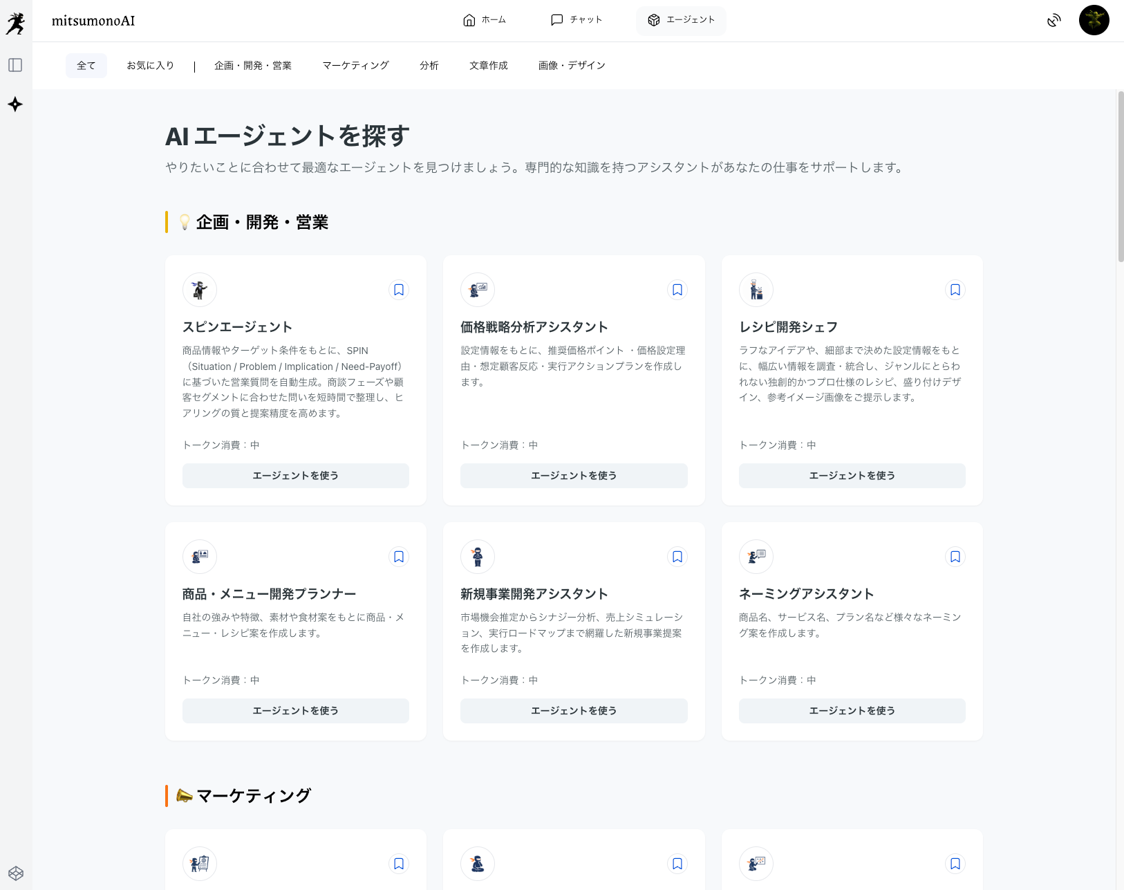 「企画・開発・営業」「マーケティング」「分析」「文書作成」など、多岐にわたる専門エージェントの中から、目的に合ったものを即座に見つけられる絞り込み機能を実装しました。